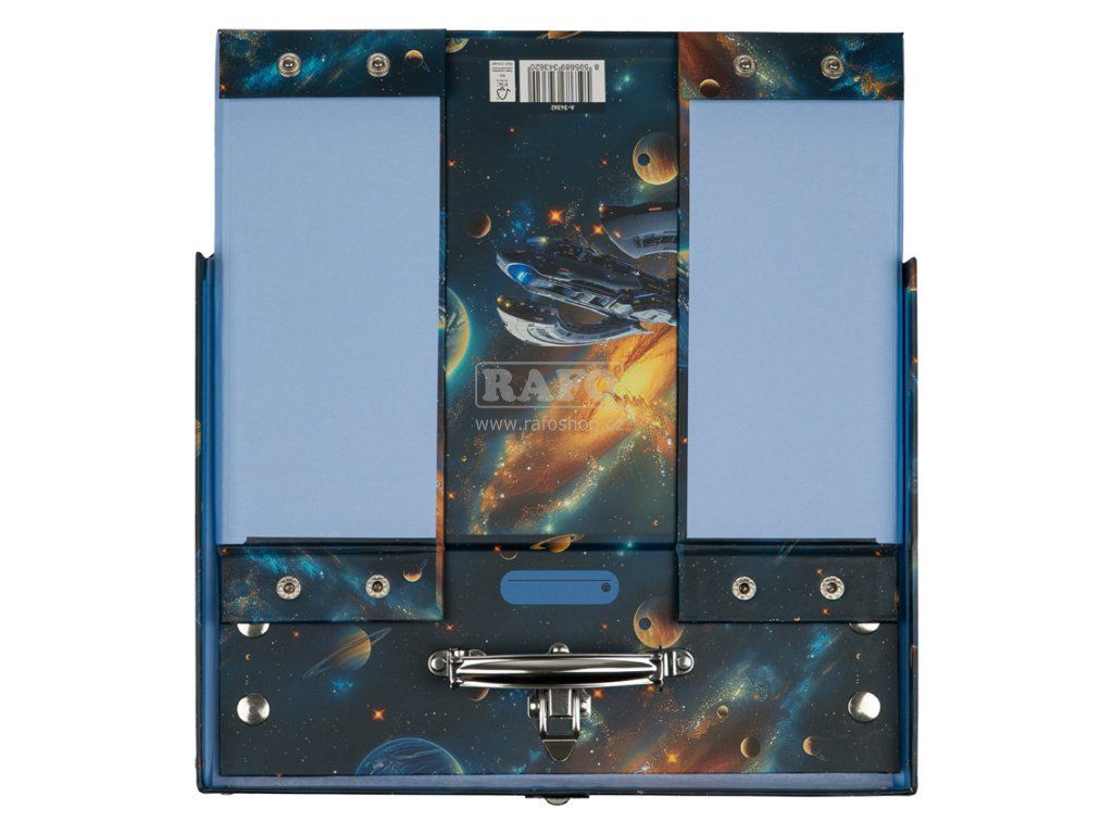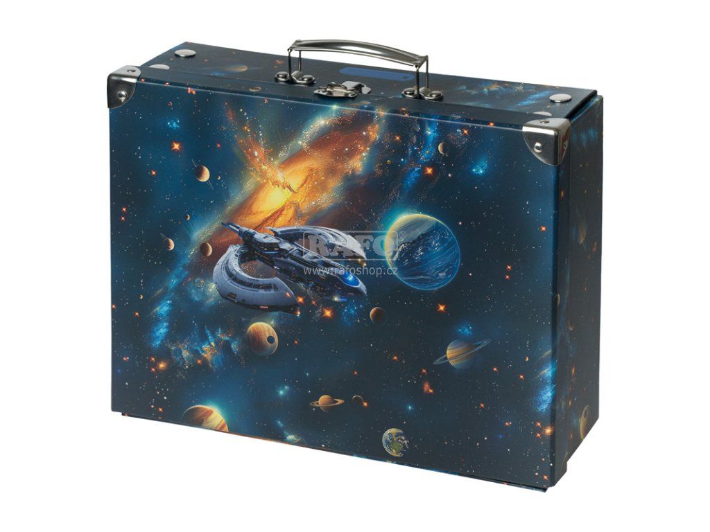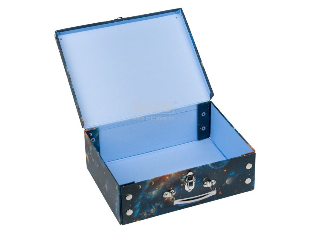 Praktický skládací kufřík s kováním a fascinujícím vesmírným motivem je ideální na uložení výtvarných potřeb, hraček či drobností. • Praktický skládací kufřík na výtvarnou výchovu, hračky či drobnosti. • Díky důmyslnému systému patentek lze kufřík s okovanými rohy snadno složit i rozložit během několika vteřin. • Klasické uzavírání na přezku a kovové ucho zajišťují snadné a pohodlné nošení. • Vyroben z pevného laminovaného papíru. • Rozměry 32,5 x 26 x 10 cmDoplňkové parametry