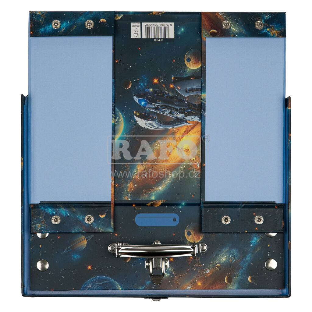 Praktický skládací kufřík s kováním a fascinujícím vesmírným motivem je ideální na uložení výtvarných potřeb, hraček či drobností. • Praktický skládací kufřík na výtvarnou výchovu, hračky či drobnosti. • Díky důmyslnému systému patentek lze kufřík s okovanými rohy snadno složit i rozložit během několika vteřin. • Klasické uzavírání na přezku a kovové ucho zajišťují snadné a pohodlné nošení. • Vyroben z pevného laminovaného papíru. • Rozměry 32,5 x 26 x 10 cm