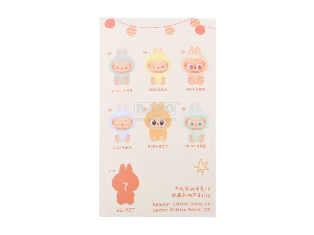 Labubu plyšová postavička. S poutkem na zavěšení. 6 variant + 1 tajná varianta. Která varianta je v balení je překvapením. Rozměry postavičky 14x9x4cm.Doplňkové parametry
