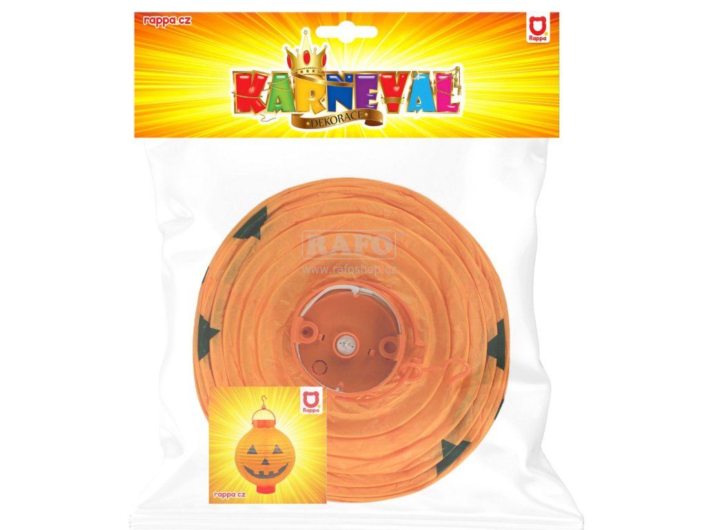 Svítící lampion s motivem dýně (tzv. Jack-o'-lantern) je perfektním doplňkem na Halloween párty. Lampion svítí po vložení 2 ks baterií typu AAA, které nejsou součástí balení. Lampion má tvar koule a je vyroben z papíru. Průměr 20 cm.Doplňkové parametry
