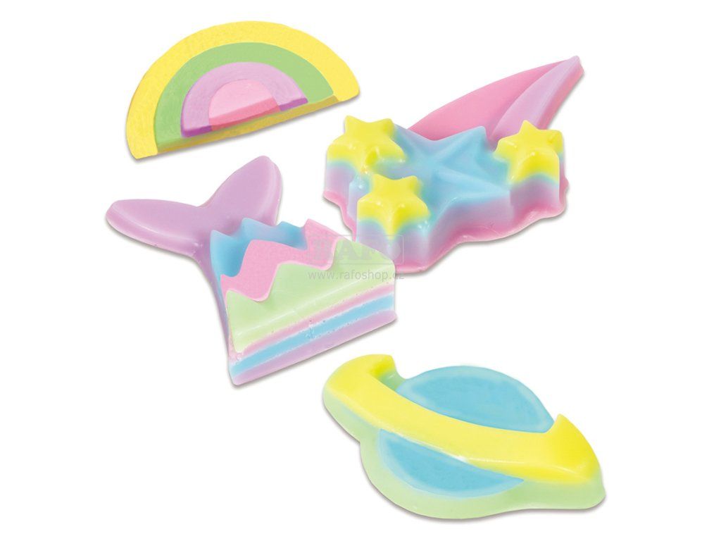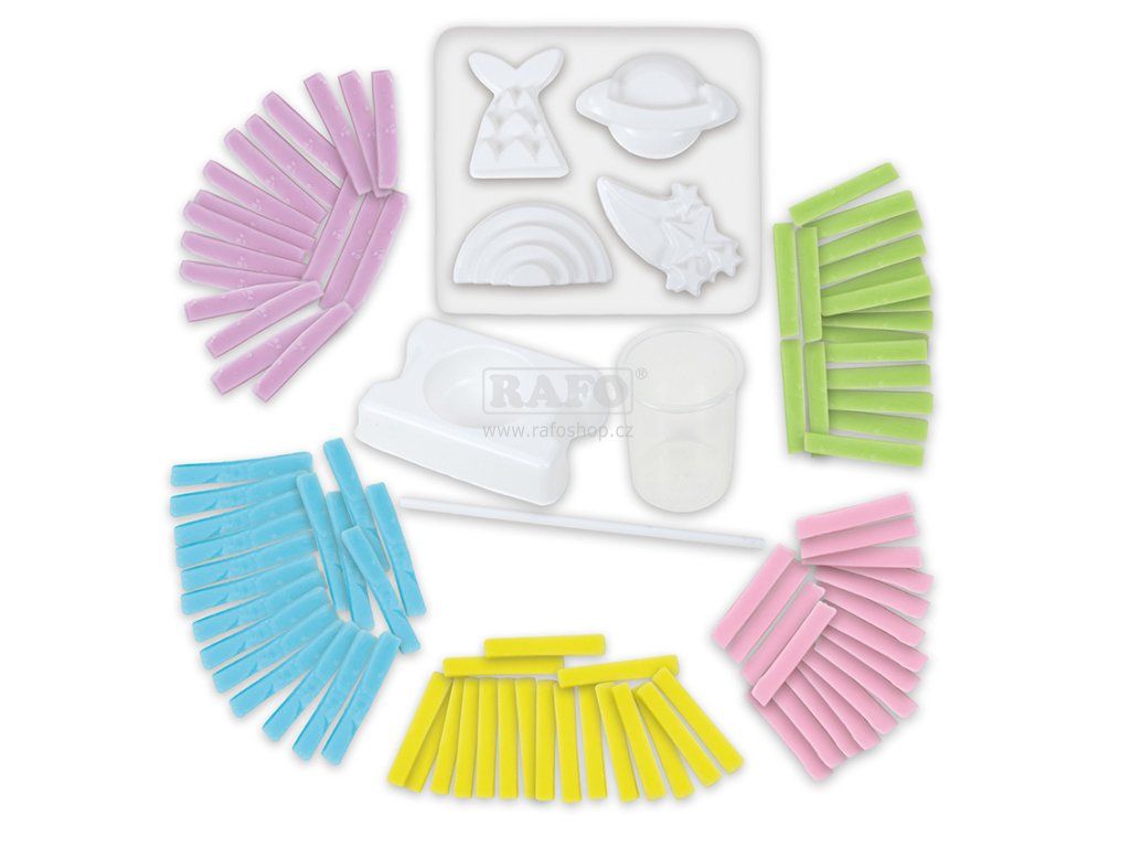 Kreativní voňavá zábava! Rozpusťte mýdlo v mikrovlnné troubě a nalijte jej do forem dříve než zatvrdne. Vytvoříte svůj vlastní sortiment mýdla různých tvarů a barev. Zábavná kreativní činnost pro celou rodinu. Obsah: 50g fialové hroznové mýdlové hmoty, 50g růžové jahodové mýdlové hmoty, 50g žluté citronové mýdlové hmoty, 50g modré pepermintové mýdlové hmoty, 50g zelené jablkové mýdlové hmoty, 1x kelímek, 1x formy, 1x držák na kelímek, míchací tyčinka a návod.Doplňkové parametry