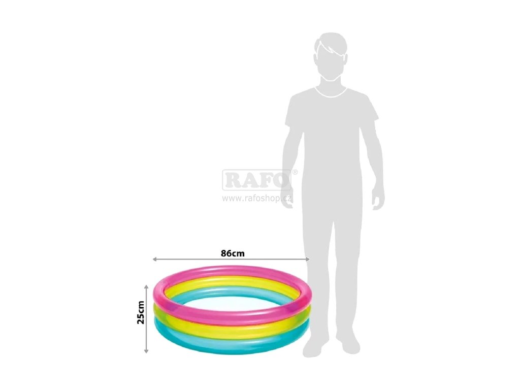Nafukovací bazén o rozměru 86 x 25 cm, Vám zaručí příjemné osvěžení v pohodlí vašeho domova. Na zahradu, terasu nebo balkón, pro malé i velké. Bazén má tři pestrobarevné komory a je vyroben z testovaného masivního vinylu.Doplňkové parametry