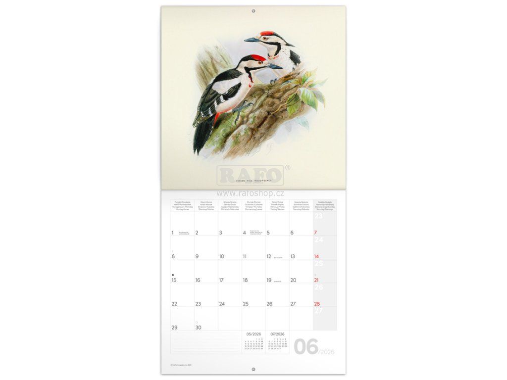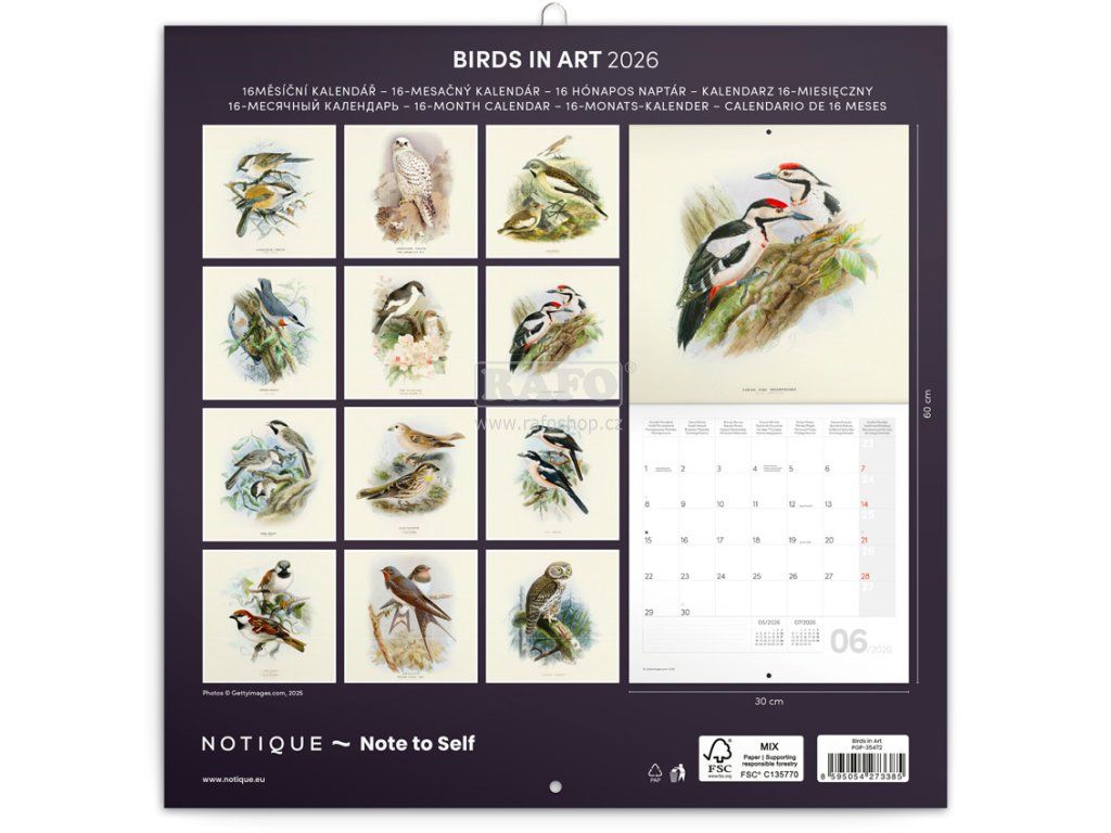 • Dvanáct ilustrací ptáků v praktickém poznámkovém kalendáři. Kalendář obsahuje přehledné kalendárium od září 2025 do prosince 2026 v osmi jazycích, měsíční fáze, důležité svátky a prostor pro poznámky na každý den. Kalendář je součástí kolekce Plastic Free, je zabalený v obálce z recyklovaného papíru a je vytištěný na recyklovaném strukturovaném papíře s vysokou gramáží. • Rozměr 30 x 30 cm • 14 listů • papír titulka 250 g/m2 – vnitřní strany 135 g/m2Doplňkové parametry