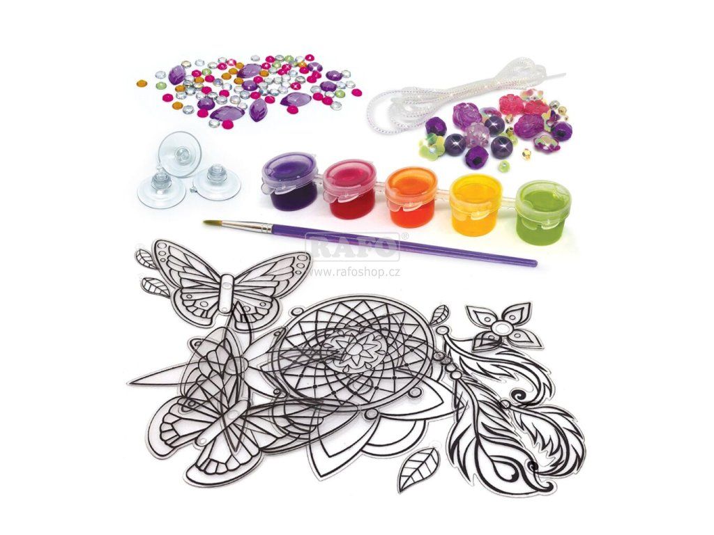 Vytvoř si kouzelné ozdoby na okna tvého pokoje! Záleží jen na tobě jak dekorace bude vypadat, fantazii se meze nekladou! V balení najdeš motýla, květinu a lapač snů, barvy, štětec, korálky a kamínky.Doplňkové parametry