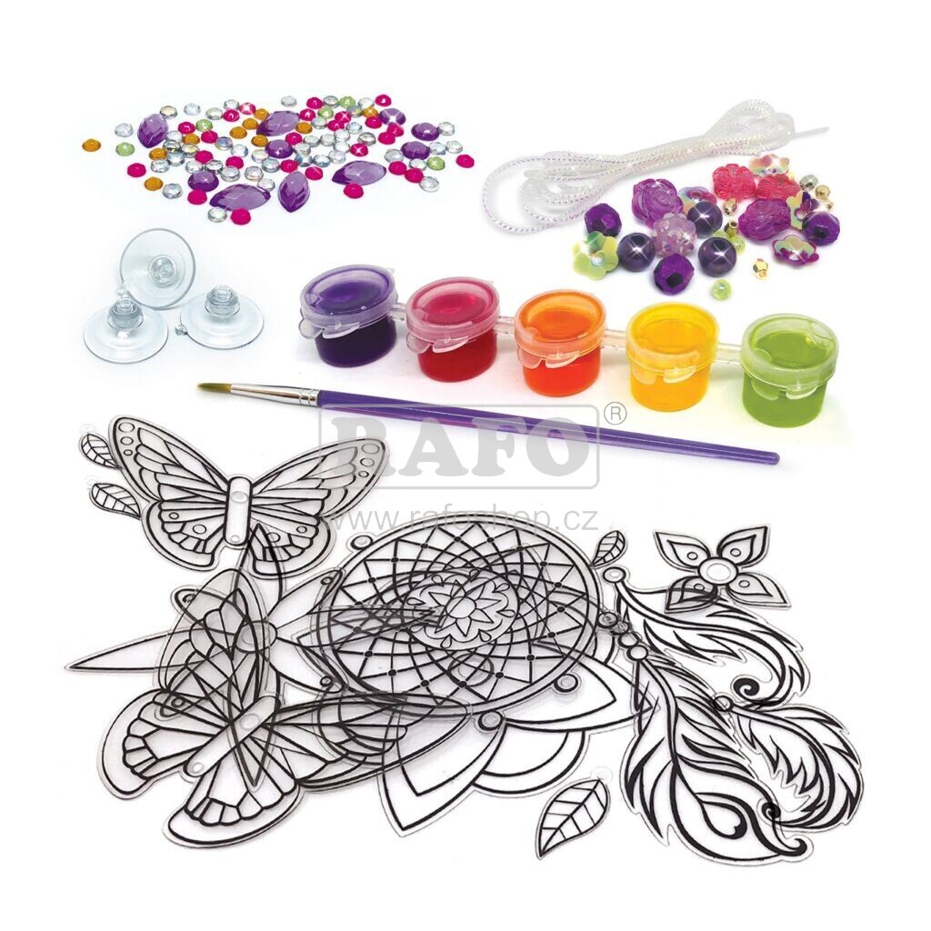 Vytvoř si kouzelné ozdoby na okna tvého pokoje! Záleží jen na tobě jak dekorace bude vypadat, fantazii se meze nekladou! V balení najdeš motýla, květinu a lapač snů, barvy, štětec, korálky a kamínky.