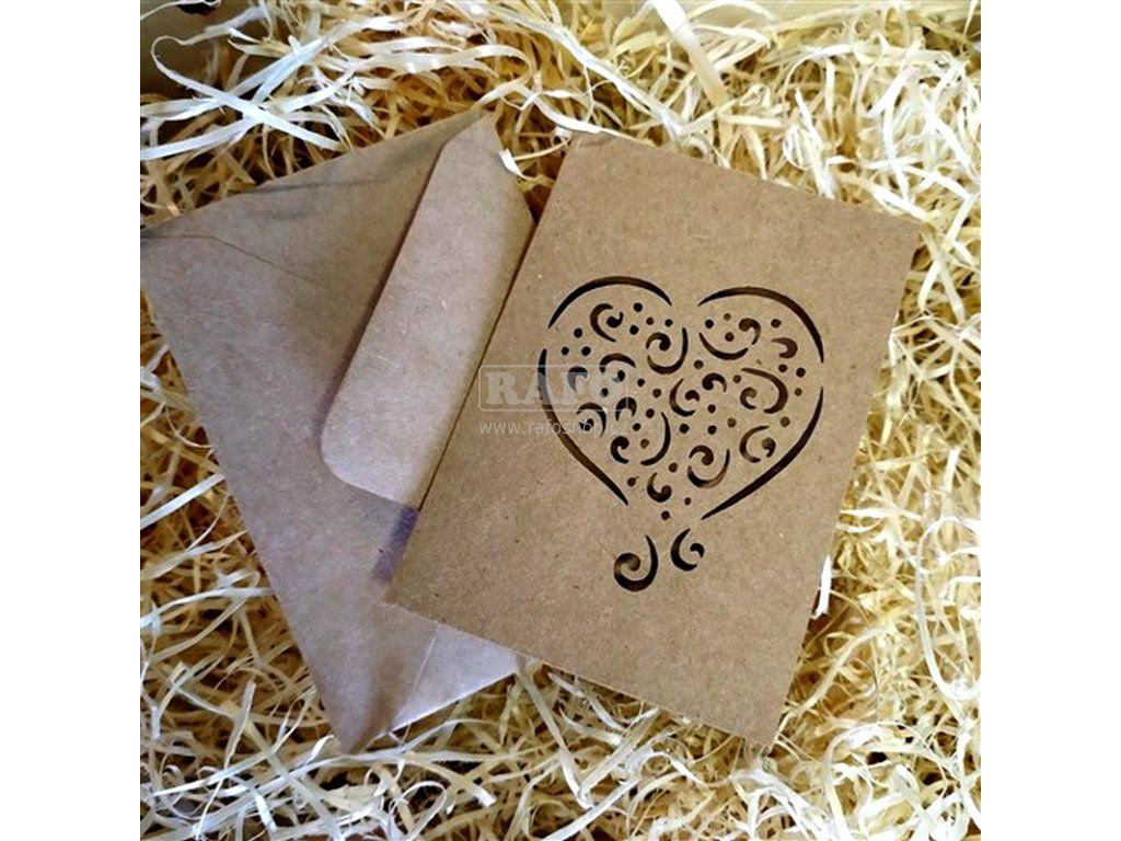 Přání z tvrdého kraftového papíru s výsekem srdce. Rozměr obálky 70x100 mm, vlhčící šípová klopa. Barva kraft tmavě béžová. Balení obsahuje 5 přání + 5 obálek. Ideální na svatby, Valentýn a podobné příležitosti.Doplňkové parametry
