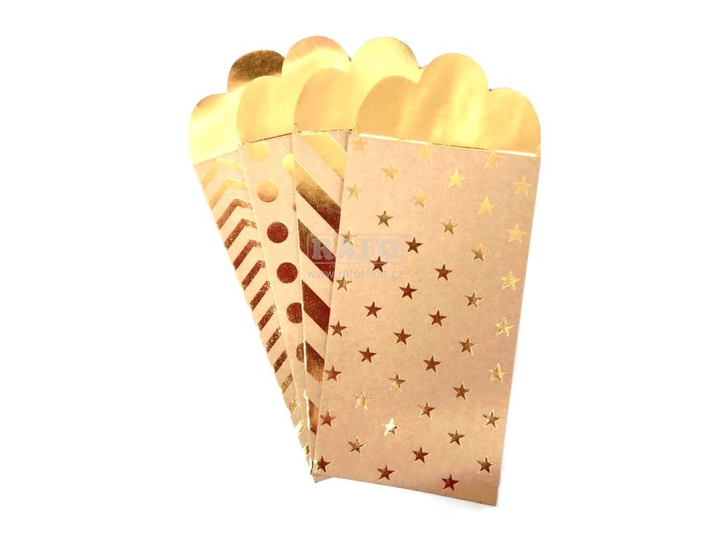 Dárkové obálky z kraftového papíru s lesklým zlatým dekorem (motiv hvězdy, puntíky či pruhy, dodáváno dle skladové dostupnosti).Doplňkové parametry