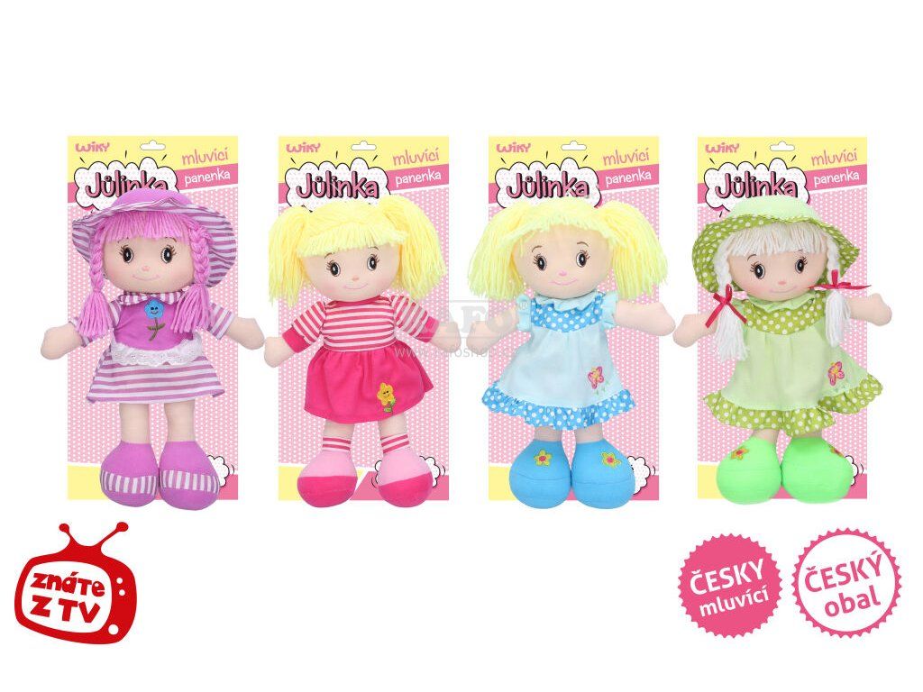 Ahoj, já jsem tvoje panenka Jůlinka. Budeme si spolu hrát celý den a naučíme se spoustu říkanek! Stačí stlačit bříško a povím Ti 4 české říkanky! Panenka Jůlinka bude tvou novou kamarádkou, se kterou se naučíš nejznámější písničky a užiješ legraci! Tak kterou si vybereš? Látkovou panenku s roztomilým obličejem, velkými kukadly, krásnými šatičkami a vlásky z vlny si oblíbí všechny malé slečny! Díky měkkému tělíčku i hlavičce může být kamarádkou nejen při hraní, ale také při usínání! Říkanky: Dobré ráno, dobrý den,... Nachystáme tělíčko, zacvičíme maličko... Jedna lžička za babičku, jedna lžička za tátu,... Na nebi jsou světýlka, už tě čeká postýlka,... Velikost: 40 cm Doporučený věk: 0+ Baterie 3xAG13 jsou součástí. Zasíláme náhodně dle skladové dostupnosti.Doplňkové parametry