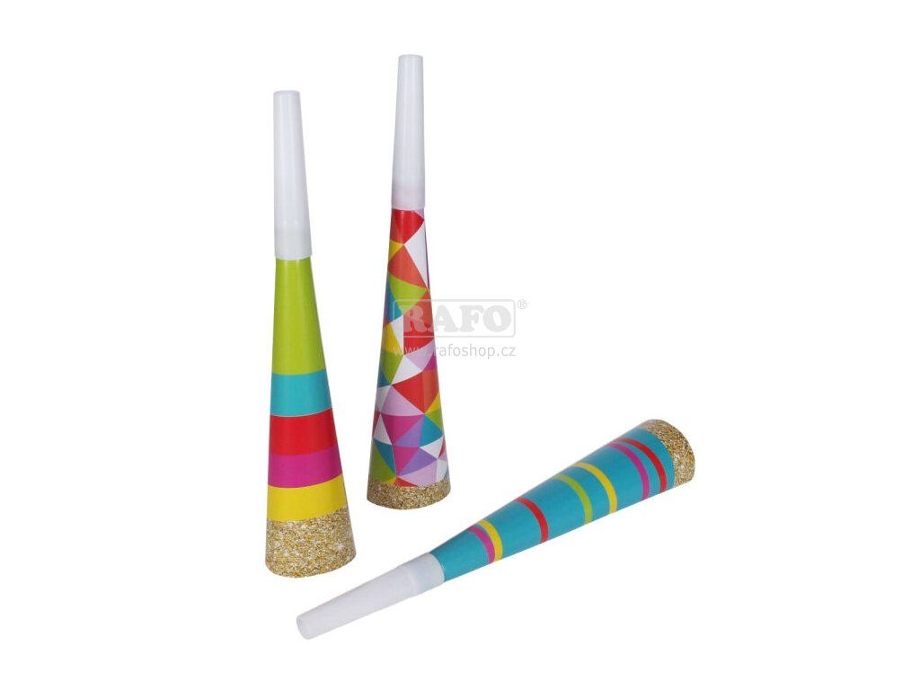 Párty trumpetky nesmí chybět na žádné narozeninové oslavě! Počet kusů: 6. Materiál papír/plastDoplňkové parametry