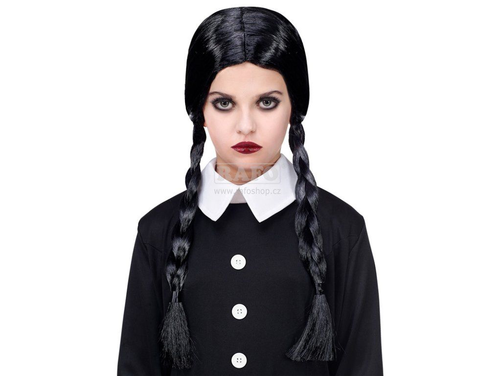 Černá rovná paruka pro dívky s pěšinkou uprostřed a culíky, stejně jako má Wednesday z Addamsnových. Materiál: 100% polyester.Doplňkové parametry