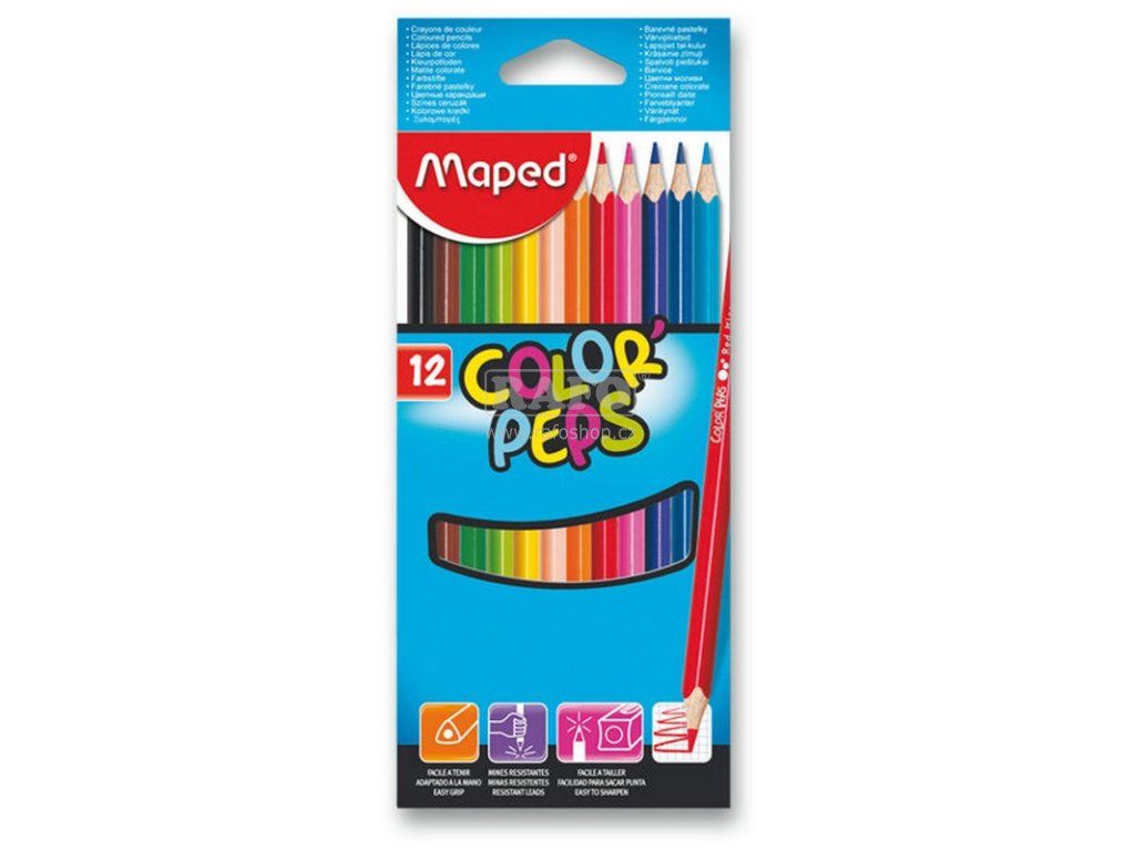 Souprava 12 kusů pastelek s veselým designem. Ergonomické pastelky Maped Color'Peps mají trojhranné tělo, měkkou odolnou tuhu a jasné barvy. Tloušťka tuhy 2,9 mm, trojhranné tělo, měkká, odolná tuha, jasné barvy, délka pastelky cca 17 cm, tloušťka tuhy 2,9 mm. Vhodné i pro leváky.Doplňkové parametry