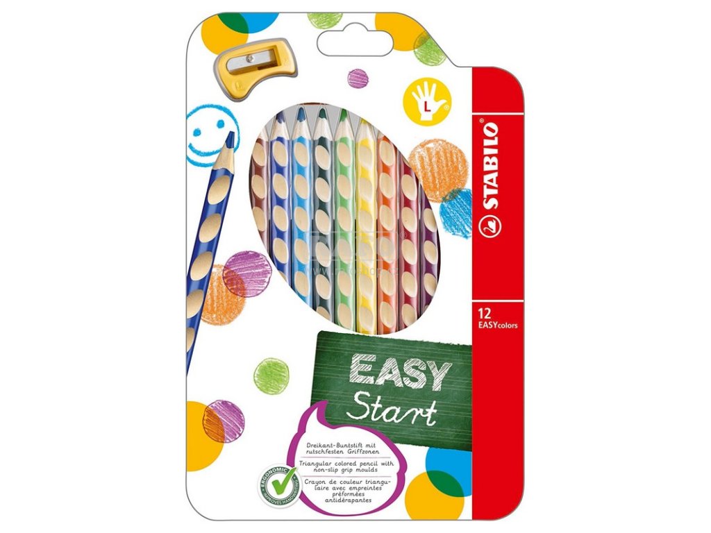 První, ergonomicky tvarované pastelky pro leváky. Součást produktové řady STABILO EASYergonomics experts - experti na ergonomii. Trojhranný design a jedinečné neklouzavé prohlubně zajistí uvolněné držení. Sada 12 ks. První, ergonomicky tvarované pastelky zvlášť pro praváky a pro leváky. Součást produktové řady STABILO EASYergonomics experts - experti na ergonomii. Trojhranný design a jedinečné neklouzavé prohlubně zajistí uvolněné držení. Žlutý nebo červený konec jasně signalizuje verzi pro leváky nebo pro praváky. Tuha tvrdosti HB je vhodná jak pro psaní, tak i skicování. Dřevo pochází z trvale udržitleného lesního hospodářství. Na každé tužce je políčko pro vepsání jména. Začít se právným držením tužky? Na to není nikdy příliš brzy. A STABILO EASYcolors vede děti hravou formou ke správnému úchopení tužky. STABILO platí díky úspěchu produktů STABILO EASY a EASYergo za uznávaného odborníka v oblasti ergonomie psaní – u školáků, učitelů a rodičů.Doplňkové parametry