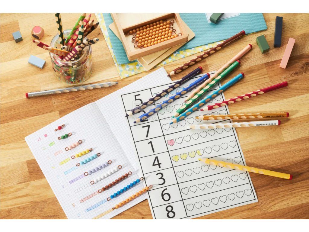 STABILO EASYcolors. Ergonomické trojhranné barevné pastelky pro předškolní děti a školáky od 5 let. První ergonomická barevná pastelka speciálně pro leváky a praváky. Trojhranný tvar a neklouzavé úchopové plošky zajišťují uvolněné držení ruky. Žlutý nebo červený konec pastelky označuje levou nebo pravou verzi. Brilantní barvy ve dřevě z udržitelného lesního hospodářství. Pastelky jsou vyrobeny ze dřeva certifikovaného PEFC® (PEFC/04-31-1728). Každá pastelka má štítek na jméno.Doplňkové parametry