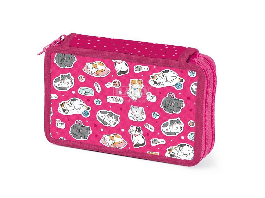 Školní dvoupatrový nevybavený penál v sytě růžové barvě s motivem koček. Penál obsahuje 24 poutek na psací potřeby a 3 větší např. na pravítko, ořezávátko, gumu nebo nůžky. Velice lehce se uzavírá díky velkému zipu a je z kvalitních a odolných materiálů. Bezesporu je nezbytnou součástí vybavení každého školáka. • Rozměr: 135 x 207 x 45 mmDoplňkové parametry