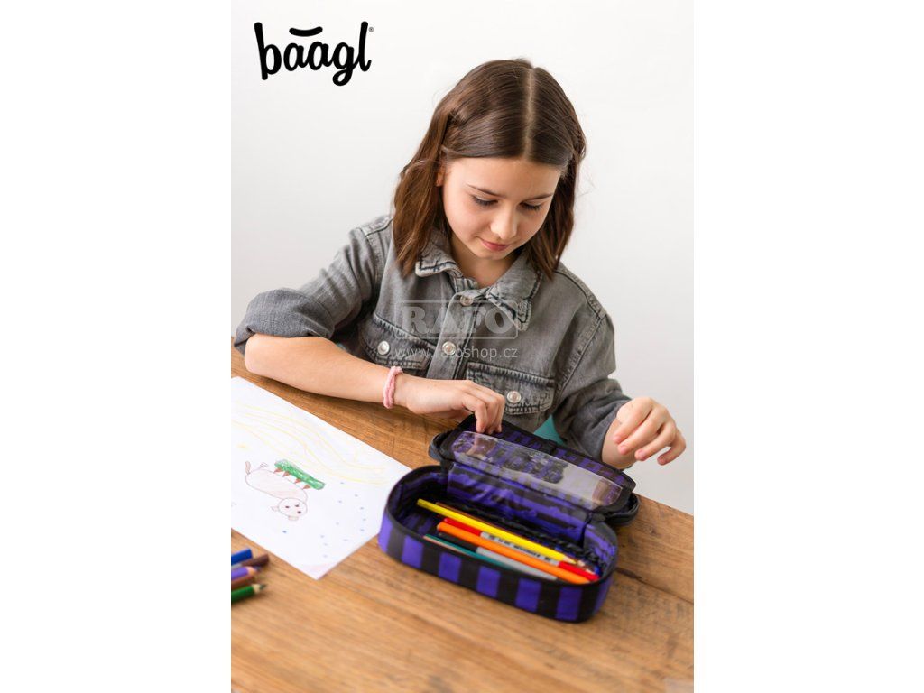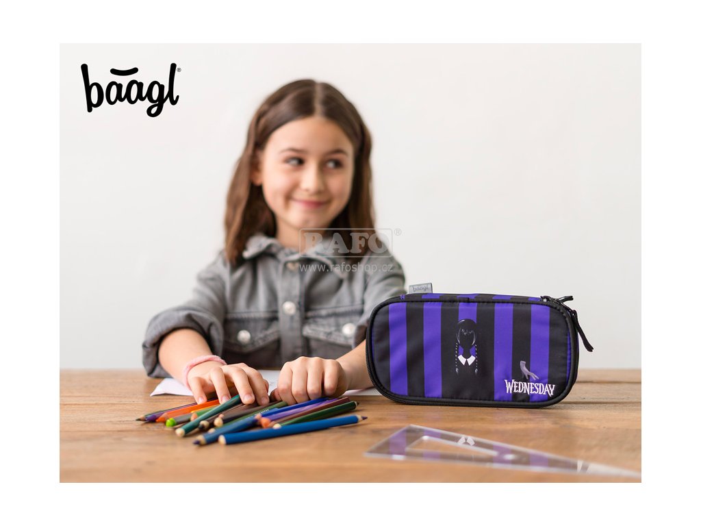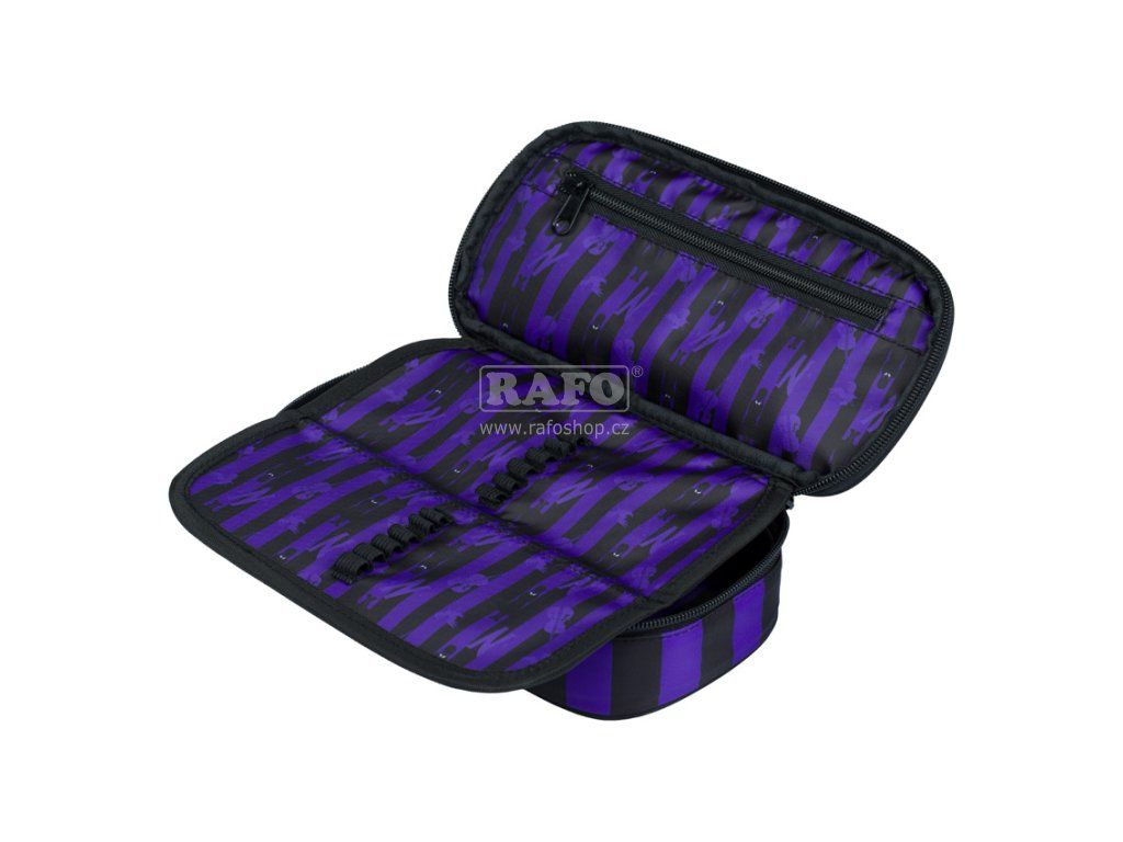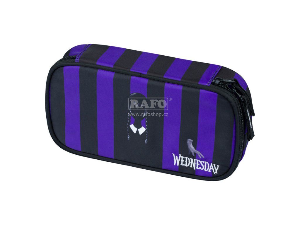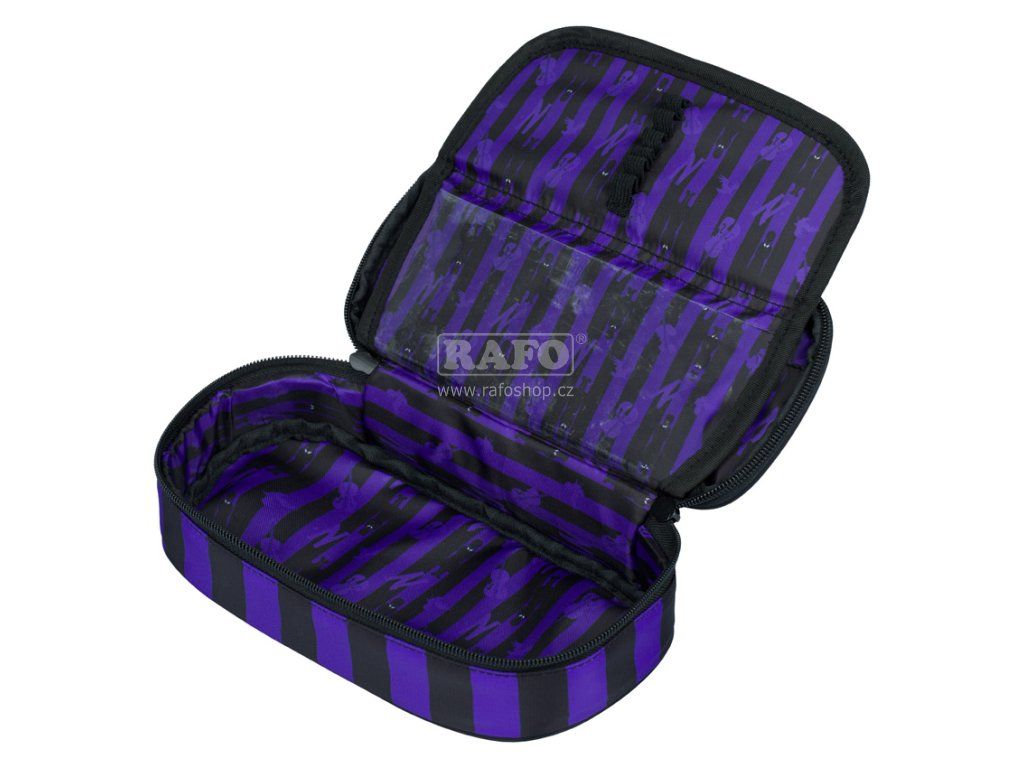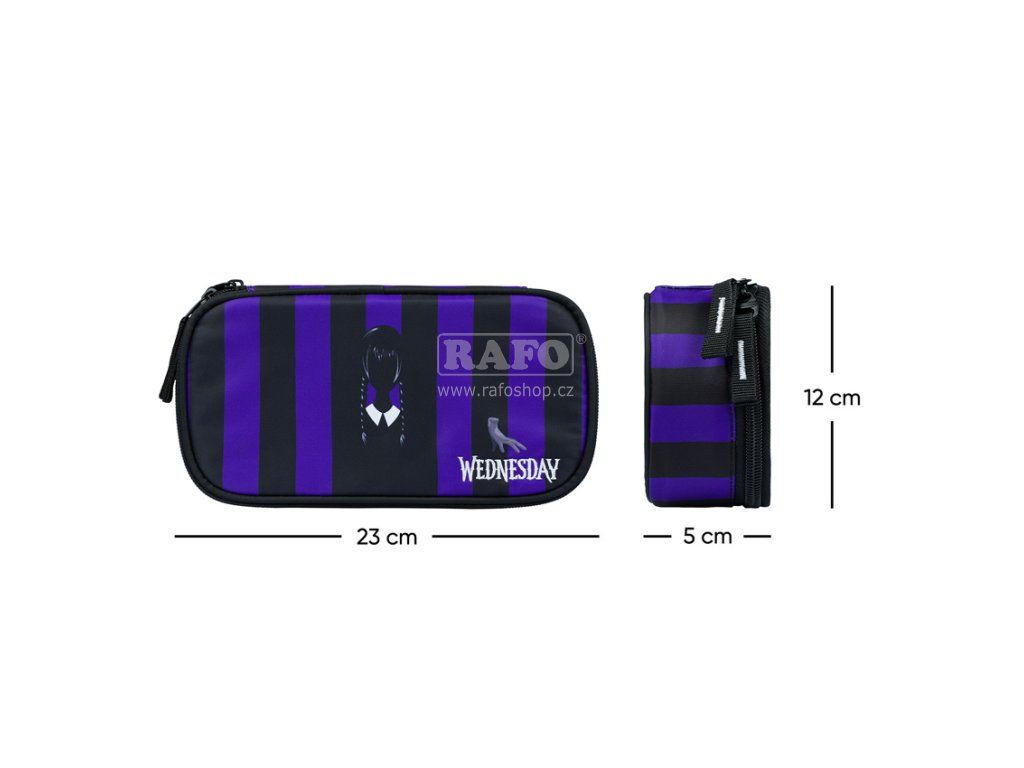 Školní penál etue s unikátním motivem populárního amerického seriálu Wednesday. Součástí penálu je hlavní kapsa a výklopná kapsička s přepážkou a gumičkami na tužky a jiné psací potřeby. • Pevný školní penál s výklopnou vnitřní přepážkou. • Vnitřní kapsa na zip a kapsa na rozvrh. • Bez náplně. • Rozměry: 23 x 12 x 5 cmDoplňkové parametry