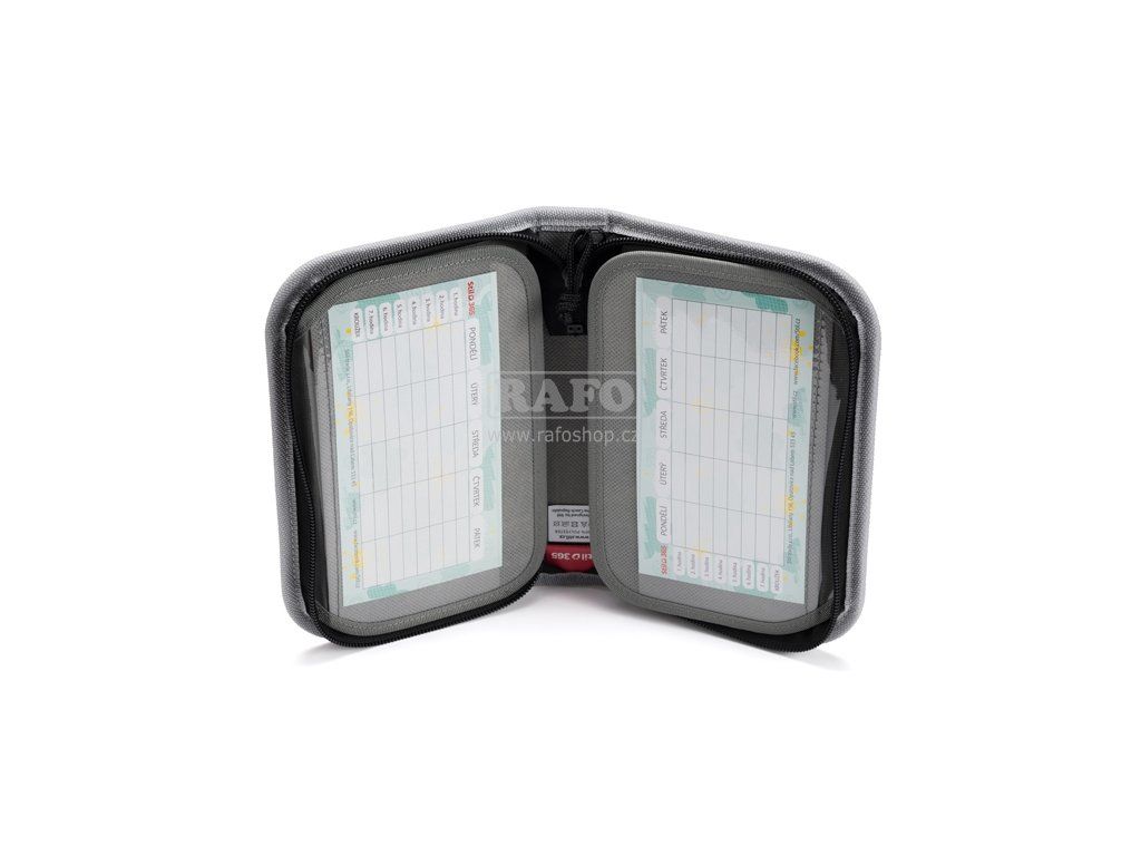 Jednopatrové penály mají velkou kapacitu k umístění psacích potřeb. 23 pevných gumiček různých velikostí k pohodlnému uložení větších pastelek nebo psacího pera, pravítka, ořezávátka a gumy. Vnitřní dvě chlopně mají na vnější straně průhlednou kapsičku na rozvrh či jiné malé dokumenty. Na vnitřní straně je kapsička na drobnosti, uzavíratelná patentem. Novinka: zipy jednopatrových penálů jsme letos vylepšili šňůrkou na jezdci zipu, který usnadní dětským prstům otevírání a zavírání penálu. Dokonale barevně sladěný design s aktovkou či batohem je samozřejmostí.Doplňkové parametry