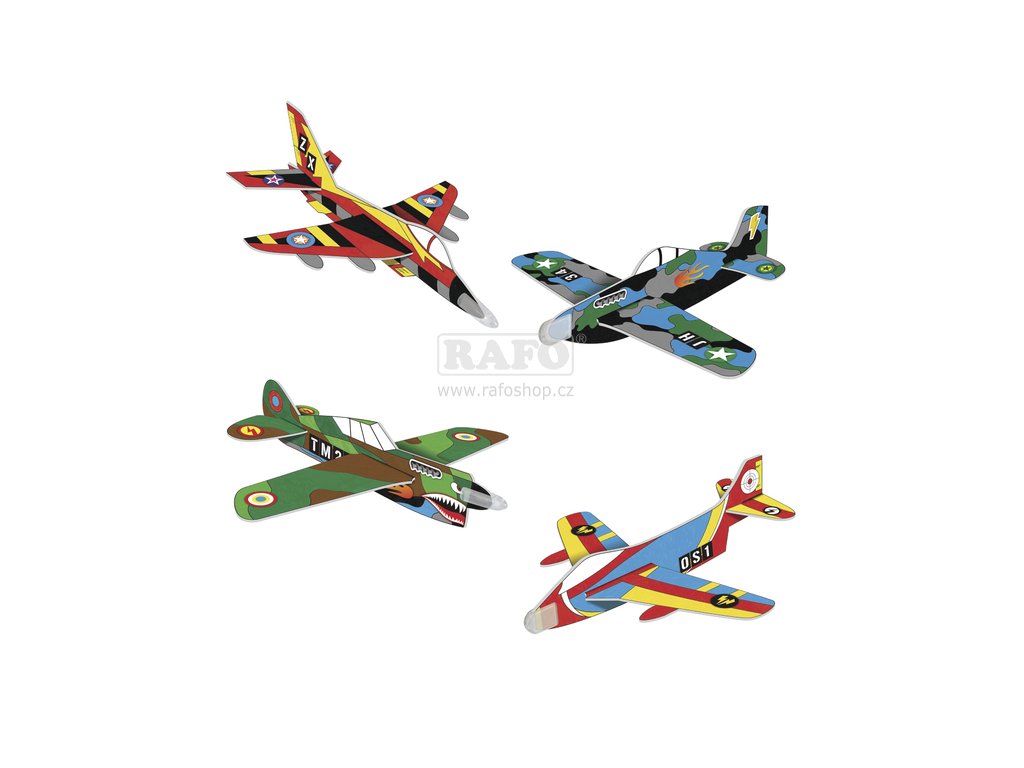 Vyrobte si letadla podle vlastní fantazie. Výroba letadel je velmi snadná. Stačí vybarvit jednotlivé díly dle vlastní fantazie, ozdobit speciálními samolepkami, poskládat jendotlivé díly a 4 parádní letadla jsou hotová a přehlídka letadel může začít. Obsahuje: díly k sestavení ze speciální pěny, 4x závaží, 8 per, samolepky, návod.UPOZORNĚNÍ Nebezpečí udušení. Nevhodné pro děti mladší 36 měsíců. Obsahuje malé části, které by mohly být spolknuty nebo vdechnuty. Obal není hračka, před použitím hračky ho odstraňte z dosahu dítěte, může způsobit zadušení.Doplňkové parametry
