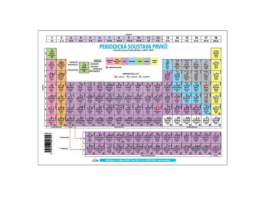 Praktická zalaminovaná periodická tabulka, umožňující díky přehlednému zařazení informací jednoduchý a rychlý přístup k údajům, které charakterizují vlastnosti jednotlivých prvků. Tabulka je určena všem zájemcům o chemii, žákům základních škol a středoškolákům. Díky zalaminování je tabulka odolná vůči poškození. Formát: A4Doplňkové parametry