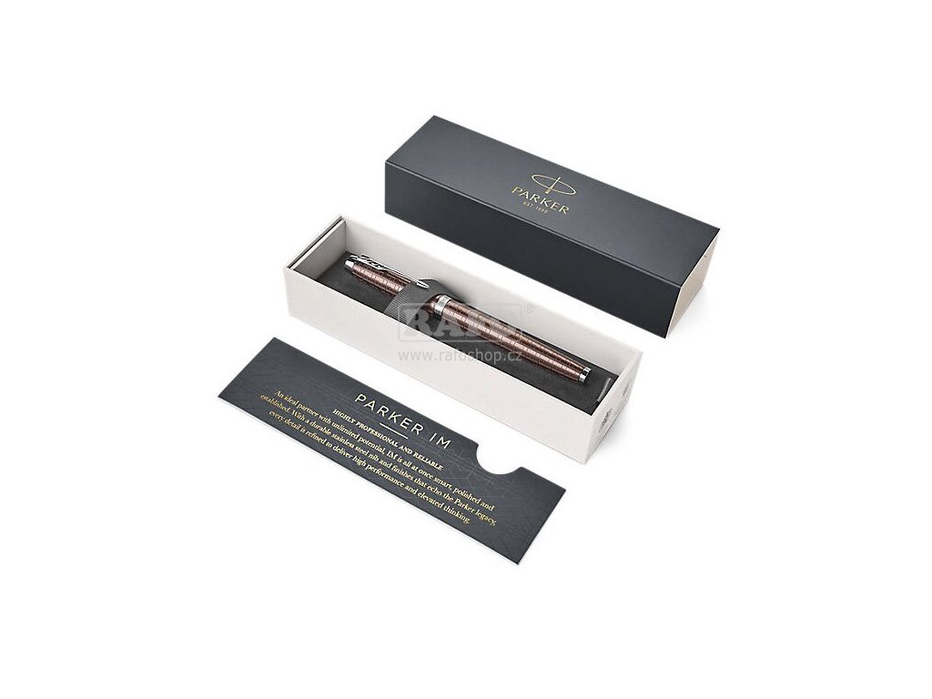 Parker IM je ideální partner s neomezenými možnostmi. Je elegantní i vysoce profesionální a spolehlivý. Nabízí odolný hrot z ušlechtilé nerezové oceli, širokou paletu provedení inspirovaných tradicí značky Parker, uživatelské pohodlí i maximální výkonnost. Lakované mosazné tělo a víčko se zdobnou rytinou. V kombinaci s doplňky pokovenými chromem, s leštěnou úpravou. Hrot z ušlechtilé nerezové oceli. Plnicí pero: nasazovací víčko, přizpůsobeno výhradně k používání inkoustových bombiček Quink nebo konvertoru (není součástí balení). Dodáváno s modrou bombičkou, v elegantním dárkovém balení. Hrot F.Doplňkové parametry