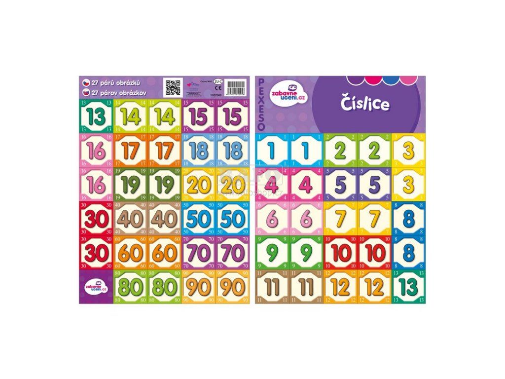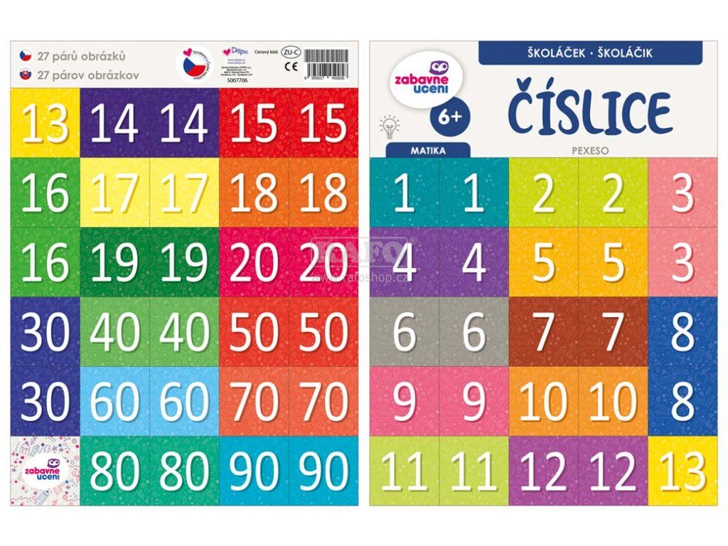 Aby počítání bylo snadné, pexeso umožní jednoduché seznámení se s čísly od 1-20 a desítkami 10-90. Vhodné pro předškoláčky a prvňáčky. Arch obsahuje 27 párů kartiček. Rozměr pexesa: 297 x 222 mmDoplňkové parametry