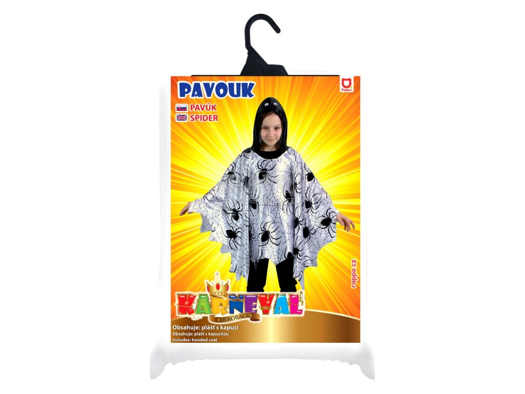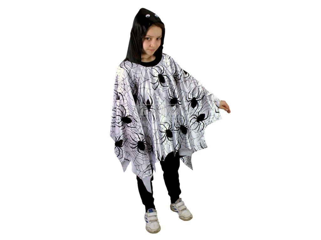 Dětský plášt s kapucí je určen pro všechny holky a kluky ve věkovém rozmezí cca 3-10 let (104-150 cm). Plášť bílé barvy s černým potiskem pavouků a pavučin je doplněn černou kapucí s očima. Ideální doplněk na Halloween párty či slavnosti čarodějnic. Délka pláště cca 65 cm.Doplňkové parametry