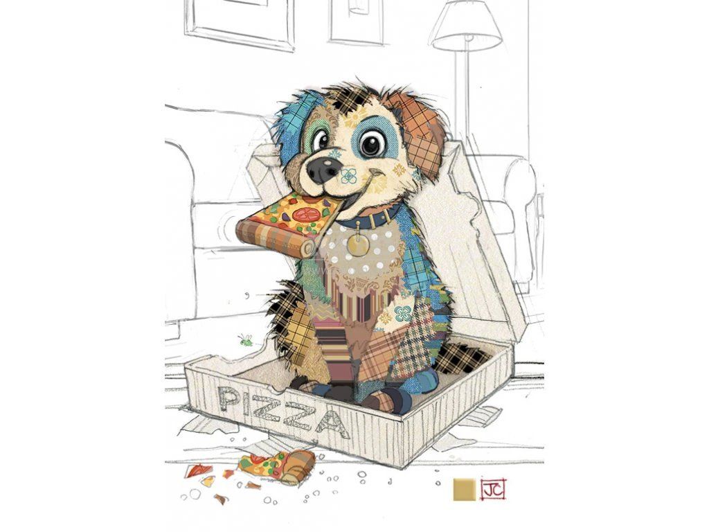 Přání Bug Art A6, patchwork - Pejsek a pizza