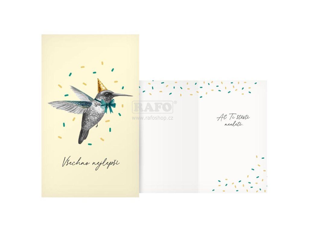 Přání srdečné k narozeninám. Přání je s motivem kolibříka. Oslavy narozenin patří k výjimečným a příjemným okamžikům v životě. Potěšte oslavence a spolu s dárkem mu věnujte originální a krásné přáníčko, které mu bude připomínat tuto radostnou událost. • Text na přední straně přání: Všechno nejlepší • Text uvnitř přání: Ať Ti štěstí neuletí. • Papír: pohlednicový karton 240 g • Rozměr: 114 x 190 mm • bílá obálkaDoplňkové parametry
