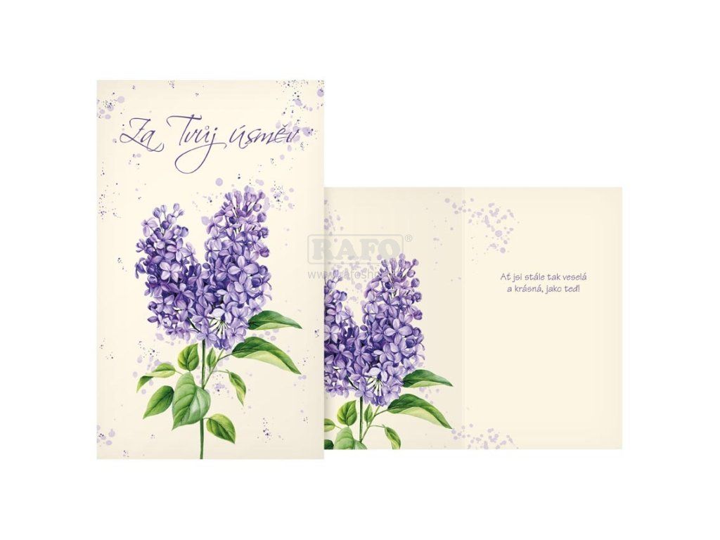 Přání srdečné. Přání k narozeninám, svátku nebo jiné příležitosti s obrázkem šeříku. Uděláte tím určitě velkou radost. Text na přední straně přání: Za tvůj úsměv • Text uvnitř přání: Ať jsi stále tak veselá a krásná, jako teď! • Papír: pohlednicový karton 240 g • Rozměr: 114 x 190 mm • bílá obálkaDoplňkové parametry