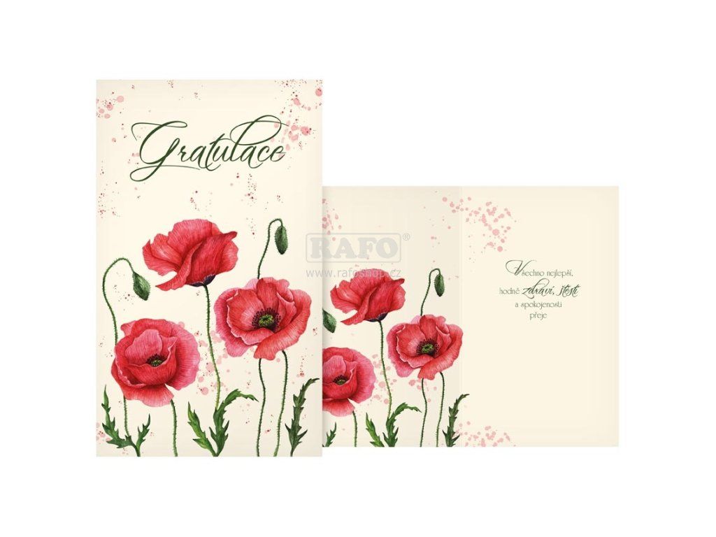 Srdečné přání k narozeninám s textem a obrázkem vlčích máků. Potěšte oslavence a spolu s dárkem mu věnujte originální a krásné přáníčko, které mu bude připomínat tuto radostnou událost. Text na přední straně přání: Gratulace • Text uvnitř přání:Všechno nejlepší, hodně zdraví,štěstí a spokojenosti přeje • Papír: pohlednicový karton 240 g • Rozměr: 114 x 190 mm • bílá obálkaDoplňkové parametry