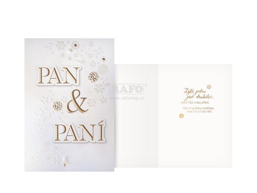 Svatební přání s elegantním reliéfním nápisem "Pan & Paní" a jemnými zlatými detaily je krásným způsobem, jak vyjádřit novomanželům upřímné gratulace. Toto přání je skvělým způsobem, jak novomanželům popřát vše nejlepší v jejich společné cestě životem a zároveň jim poskytne vzpomínku na jejich výjimečný den. Rozměr: 125 x 180 mmDoplňkové parametry