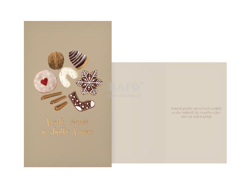Vánoční přání. Toto elegantní vánoční přání s motivem vánočního cukroví je perfektní způsob, jak svým blízkým popřát veselé a sladké Vánoce. Je ideální pro ty, kteří ocení tradiční vánoční motivy a jednoduchou, ale přitom elegantní formu přání. Rozměr: 113 mm x 190 mm x 1 mm (Š x V x H)Doplňkové parametry