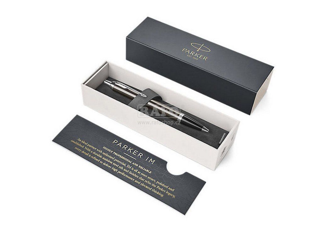 Parker IM je ideální partner s neomezenými možnostmi. Je elegantní i vysoce profesionální a spolehlivý. Nabízí odolný hrot z ušlechtilé nerezové oceli, širokou paletu provedení inspirovaných tradicí značky Parker, uživatelské pohodlí i maximální výkonnost. Tělo z eloxovaného hliníku se zdobnou rytinou vyvedenou pomocí laseru, leštěná povrchová úprava. V kombinaci s doplňky pokovenými chromem, s leštěnou úpravou. Kuličková tužka (kuličkové pero, propiska): stiskací mechanismus, dodáváno s modrou náplní. Dodáváno v elegantním dárkovém balení.Doplňkové parametry