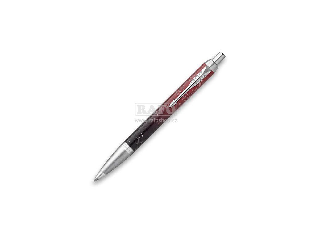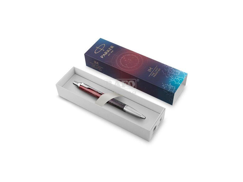 Parker IM je ideální partner s neomezenými možnostmi. Je elegantní i vysoce profesionální a spolehlivý. Nabízí odolný hrot z ušlechtilé nerezové oceli, širokou paletu provedení inspirovaných tradicí značky Parker, uživatelské pohodlí i maximální výkonnost. Tělo z eloxovaného hliníku se zdobnou rytinou vyvedenou pomocí laseru, leštěná povrchová úprava. V kombinaci s doplňky pokovenými chromem, s leštěnou úpravou. Kuličková tužka Parker IM Last Frontier Portal s lakovaným tělem a víčkem z nerezové oceli s jedinečným barevným stínováním od tmavě červené až po půlnoční černou. Doplněné zdobnými prvky, inspirovanými neomezeným vesmírem, vytvořenými pomocí laseru. V kombinaci s mosaznými doplňky pokovenými chromem. Úchopová část z leštěného chromu. Kuličková tužka (kuličkové pero, propiska): stiskací mechanismus, dodáváno s modrou náplní. Dodáváno v elegantním dárkovém balení.Doplňkové parametry