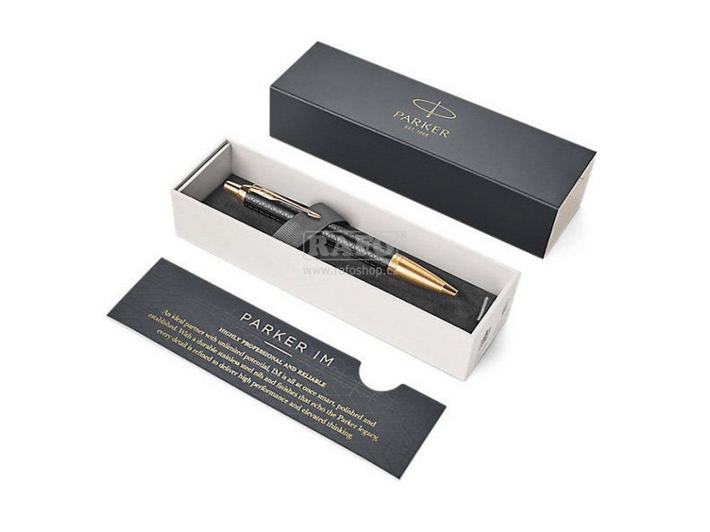 Parker IM je ideální partner s neomezenými možnostmi. Je elegantní i vysoce profesionální a spolehlivý. Nabízí odolný hrot z ušlechtilé nerezové oceli, širokou paletu provedení inspirovaných tradicí značky Parker, uživatelské pohodlí i maximální výkonnost. Tělo z eloxovaného hliníku se zdobnou rytinou vyvedenou pomocí laseru, leštěná povrchová úprava. V kombinaci s doplňky pokovenými chromem, s leštěnou úpravou. Kuličková tužka (kuličkové pero, propiska): stiskací mechanismus, dodáváno s modrou náplní. Dodáváno v elegantním dárkovém balení.Doplňkové parametry