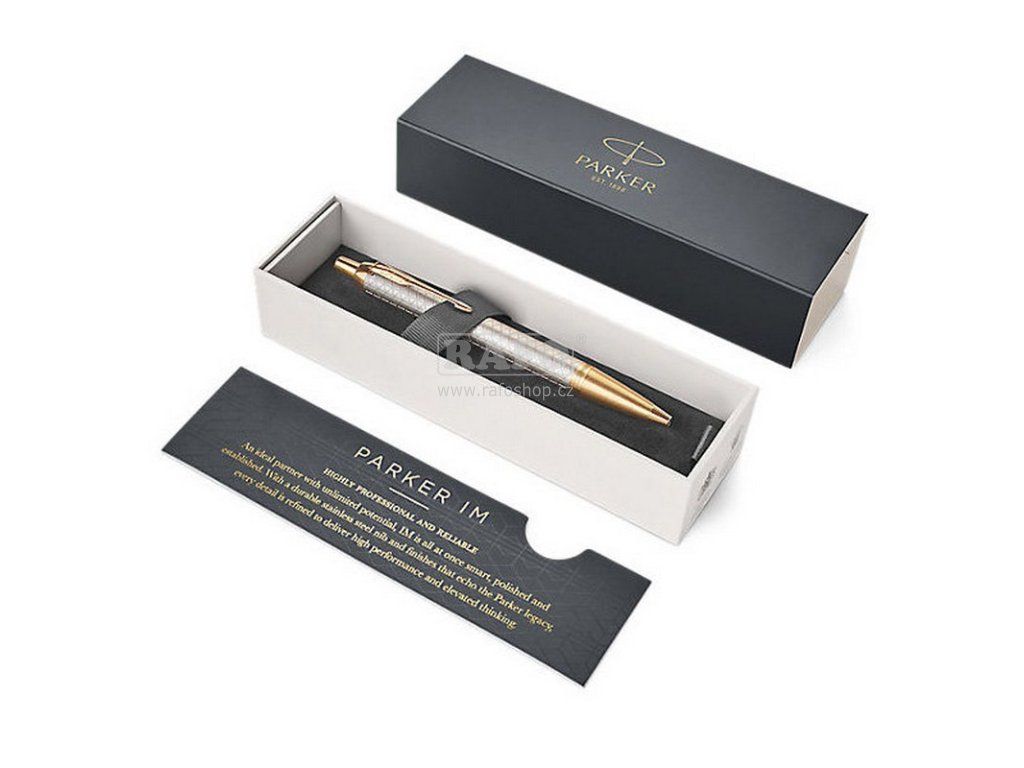 Parker IM je ideální partner s neomezenými možnostmi. Je elegantní i vysoce profesionální a spolehlivý. Nabízí odolný hrot z ušlechtilé nerezové oceli, širokou paletu provedení inspirovaných tradicí značky Parker, uživatelské pohodlí i maximální výkonnost. Tělo z eloxovaného hliníku se zdobnou rytinou vyvedenou pomocí laseru, leštěná povrchová úprava. V kombinaci s doplňky pokovenými chromem, s leštěnou úpravou. Kuličková tužka (kuličkové pero, propiska): stiskací mechanismus, dodáváno s modrou náplní. Dodáváno v elegantním dárkovém balení.Doplňkové parametry