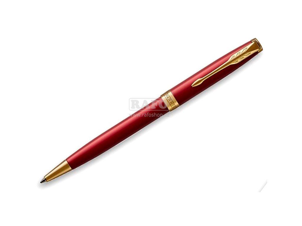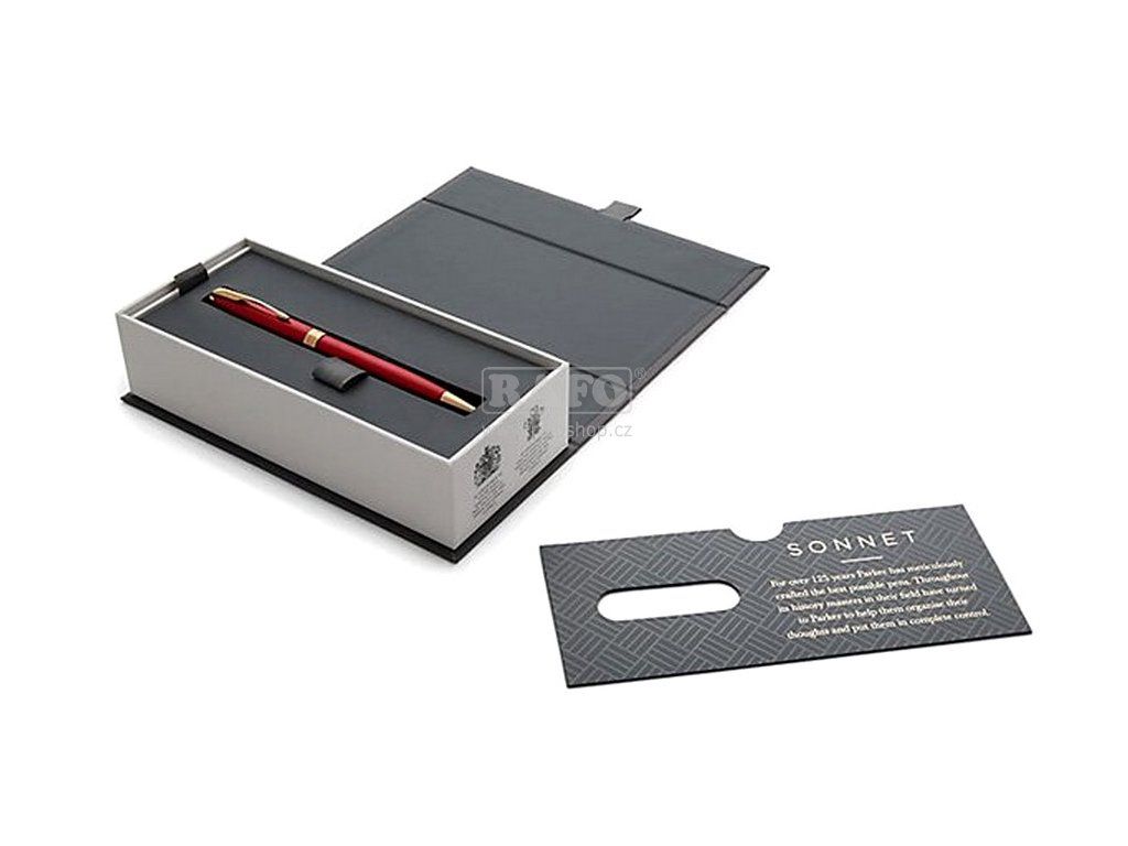 Matně červeně lakované tělo. V kombinaci s doplňky pokovenými zlatem. Kuličková tužka (kuličkové pero, propiska): otočný mechanismus, dodáváno s černou náplní. Vyrobeno ve Francii. Dodáváno v elegantním dárkovém balení. Nadčasová elegance modelu Sonnet, jeho vytříbený styl i rozmanité povrchové úpravy skvěle navazují na designérskou tradici značky Parker. Sonnet je dokonalým zosobněním všeho, co Parker umí nejlépe – mistrovského zpracování hrotů z 18karátového zlata, ideálního rozložení hmotnosti pera i pečlivého sestavení jednotlivých, celkem 17 různých dílů. Modelová řada Sonnet je skutečně nadčasová.Doplňkové parametry