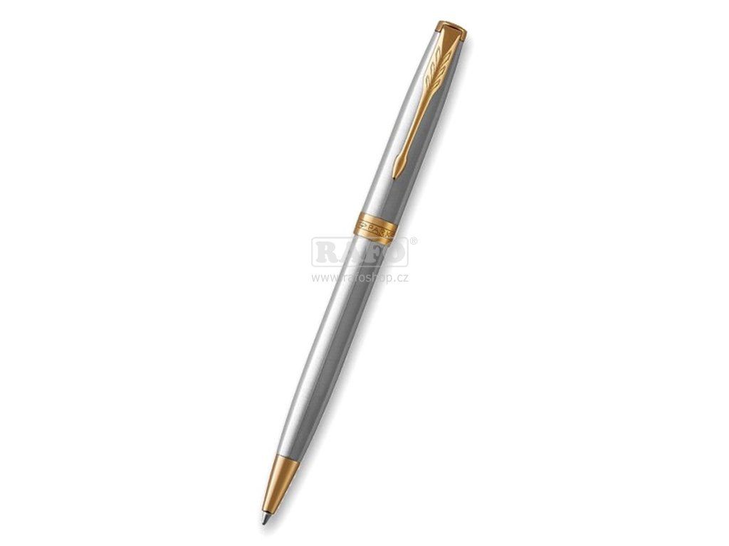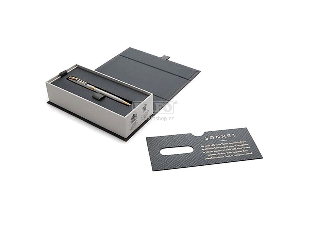 Tělo z broušené nerezové oceli. V kombinaci s doplňky pokovenými zlatem. Kuličková tužka (kuličkové pero, propiska): otočný mechanismus, dodáváno s černou náplní. Vyrobeno ve Francii. Dodáváno v elegantním dárkovém balení. Nadčasová elegance modelu Sonnet, jeho vytříbený styl i rozmanité povrchové úpravy skvěle navazují na designérskou tradici značky Parker. Sonnet je dokonalým zosobněním všeho, co Parker umí nejlépe – mistrovského zpracování hrotů z 18karátového zlata, ideálního rozložení hmotnosti pera i pečlivého sestavení jednotlivých, celkem 17 různých dílů. Modelová řada Sonnet je skutečně nadčasová.Doplňkové parametry