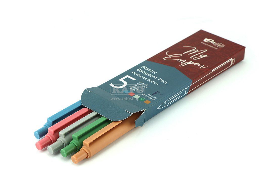 Plastové kuličkové pero s gumovým úchopem a 5 druhy vůní (banán, čokoláda, růže, jahoda, jablko). Propiska zanechává na papíře aromatickou stopu inkoustu.Doplňkové parametry