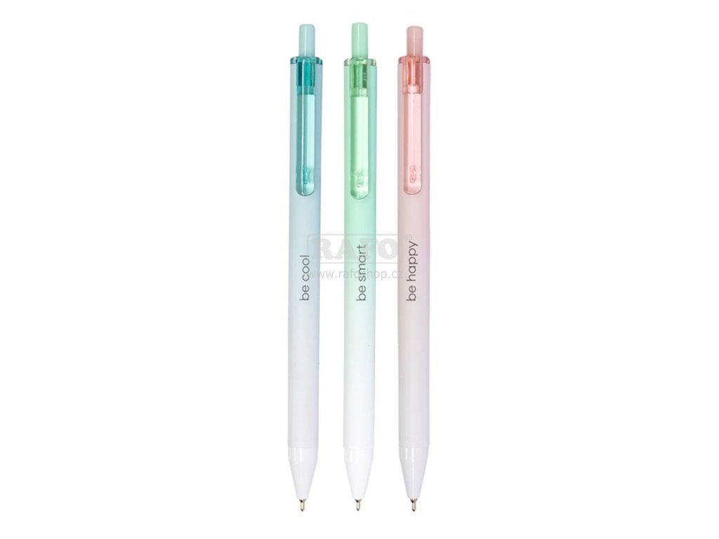 Tenké kuličkové pero v pastelových barvách s potiskem: be happy, be smart, be cool. Odlehčené plastové tělo se sametově hladkým povrchem. Modrá vyměnitelná náplň Easy Ink - inkoust s nízkou viskozitou pro pohodlnější a plynulejší psaní. Dodáváno v barevném mixu 3 barev. Šířka stopy: 0,5 mm.Doplňkové parametry