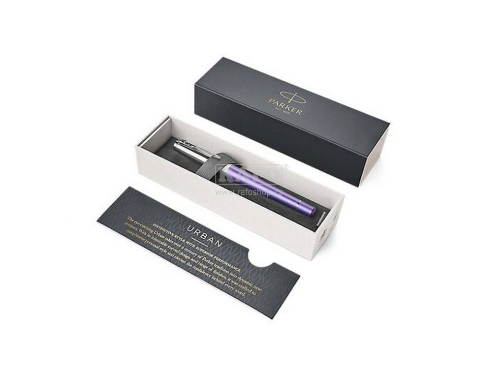 Metalické fialové tělo z eloxovaného hliníku, upravené pískováním. Mosazné víčko s povrchovou dekorativní strukturou vytvořenou leptáním, pokovené chromem a leštěné. V kombinaci s doplňky pokovenými chromem. Roller: nasazovací víčko, standardní náplň Quink pro rollery. Urban je mladá, svěží generace psacích potřeb, která posouvá hranice a nastavuje nová pravidla moderního psaní. Využití ergonomických znalostí umožňuje jedinečné spojení nekonvenčního tvaru s dokonalým vyvážením. Parker Urban Premium: ukázka nezaměnitelných designových rysů a rafinované povrchové úpravy vyznačující se moderností, lehkou elegancí a vysokou kvalitou.Doplňkové parametry