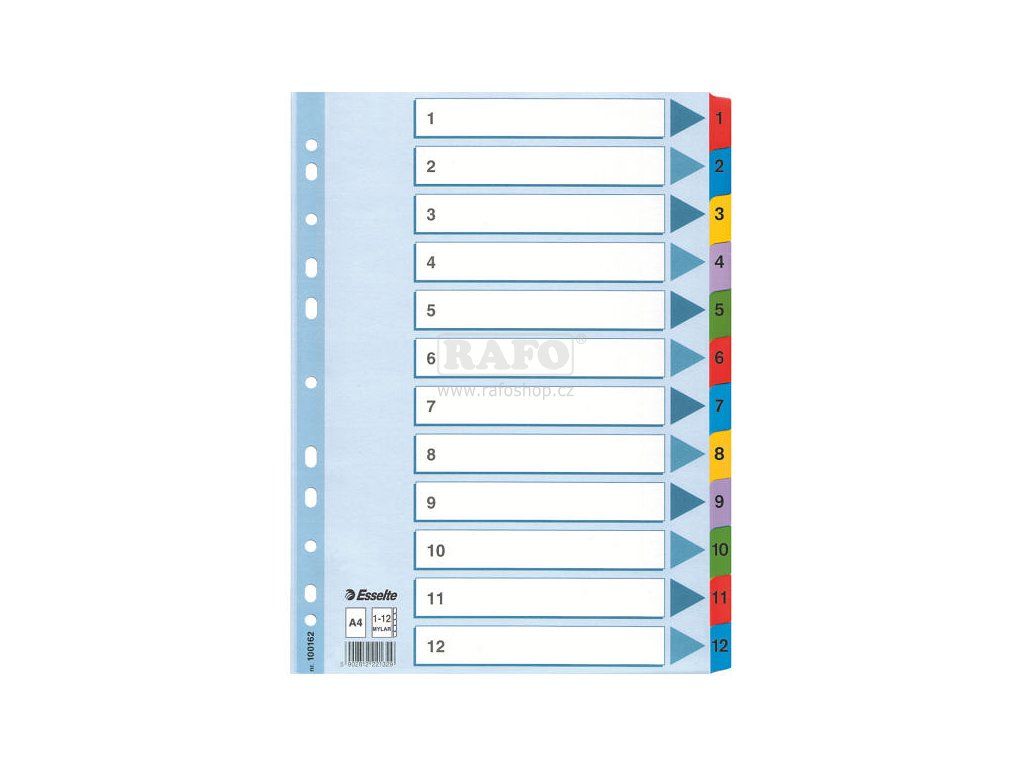 Kartonové rejstříky pro třídění dokumentů v pořadačích či deskách. Vyrobeny z kvalitního silného kartonu. Pro formát A4, 1-12.Barevné třídění. Barevné rozlišovací okraje (oboustraně potištěné) a multiperforace jsou vyztužené plastem pro výrazně delší životnost.Popisovatelný titulní list pro snadnou orientaci v zakládaných dokumentech.Univerzální multiperforace umožňuje založení do kroužkového i pákového pořadače.Doplňkové parametry
