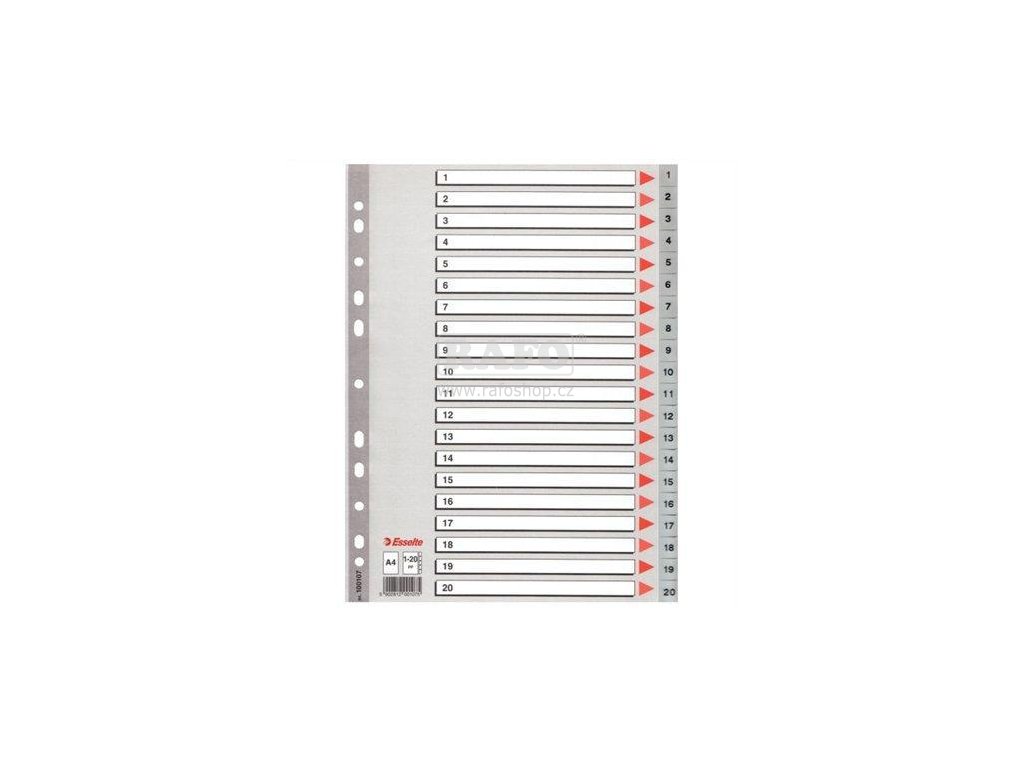 Rejstříky pro číselné roztřídění dokumentů v pořadačích či deskách do formátu A4 s popisovatelnou titulní stranou. Zesílená multiperforace plastovým proužkem na titulní straně. 20 dělicích listů se štítky 1-20 pro rychlou orientaci v obsahu. Univerzální multiperforace (11 děr) pro založení do pákového i kroužkového pořadače. Pro formát A4. Vyrobeno z Polypropylenu (PP) tloušťky 0,12 mm.Doplňkové parametry