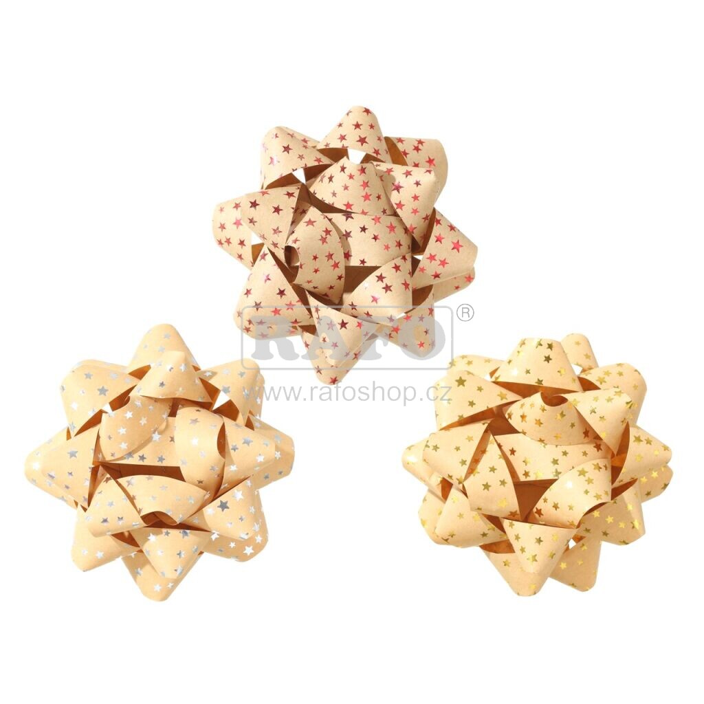 Roseta (rozetka) o průměru 10 cm, šířka stuhy: 1,5 cm. Mašle je z kraftového papíru ozdobená stříbrnými, zlatými nebo červenými lesklými hvězdami. Dodáváno dle skladové dostupnosti.