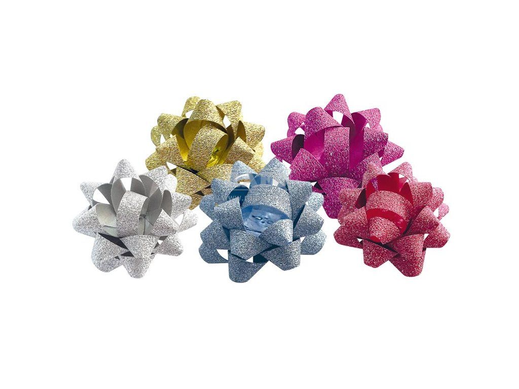 Rozetka s jemnými glitry v mixu barev. Ideální pro moderní ozdobení dárku. Rozetka má na spodní straně lepící pásku pomocí které ji připevníte na krabičku nebo jinak zabalený dárek. • Průměr: 70 mm • Šířka stuhy: 15 mm • Dodáváme v mixu barev dle skladové zásoby.Doplňkové parametry