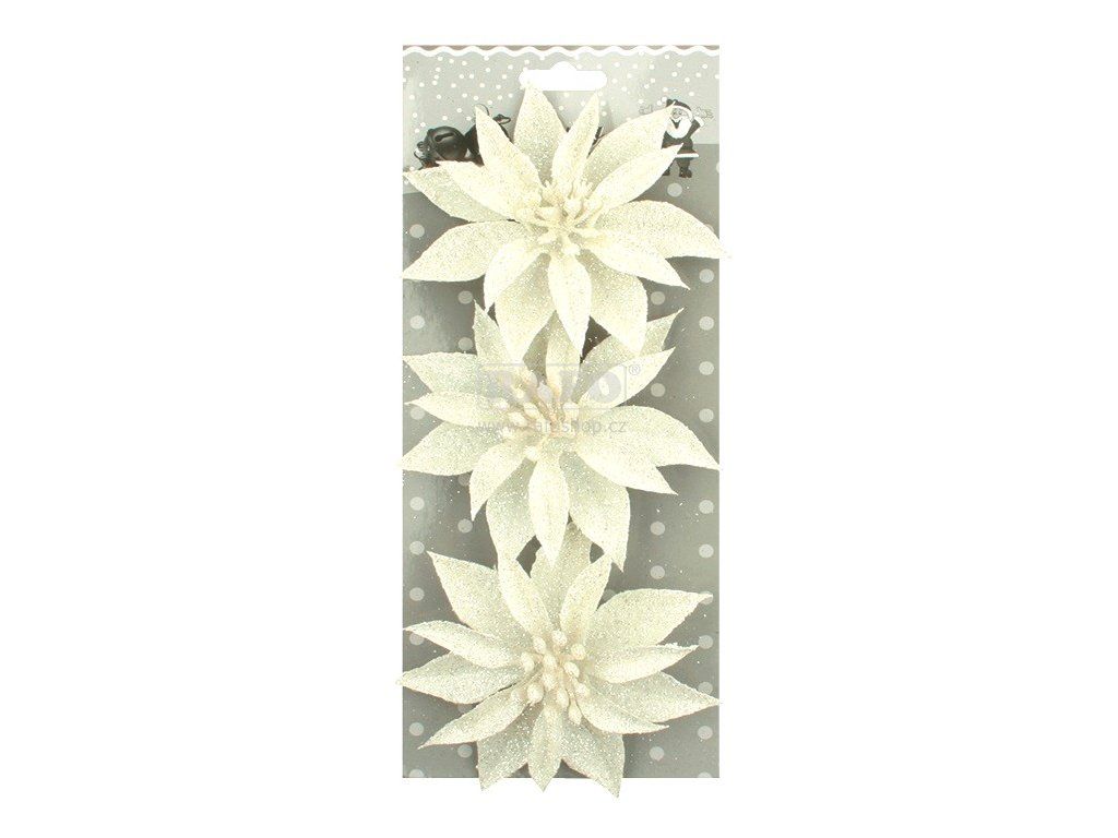Růže vánoční glitrová bílá 8 cm, 3 ks