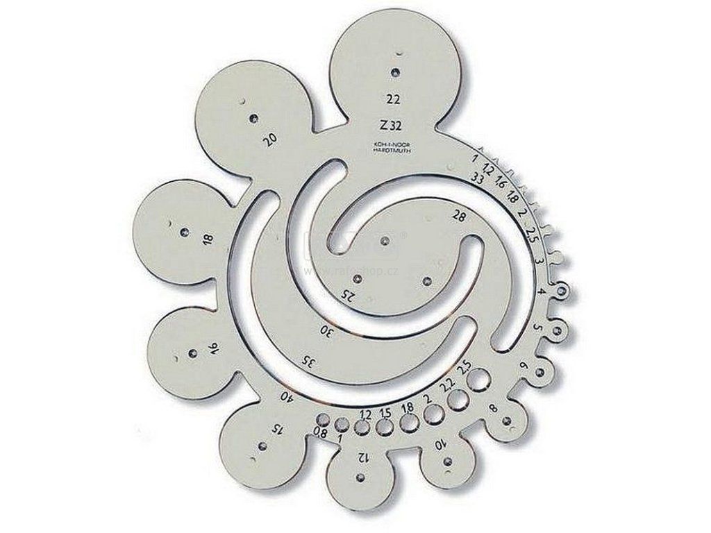 Radiusová šablona - Z32 vyrobená z kouřového průhledného polystyrenu. Je určena pro práci s ohrocenou tužkou, mikrotužkou, versatilkou nebo technickými pery.Doplňkové parametry