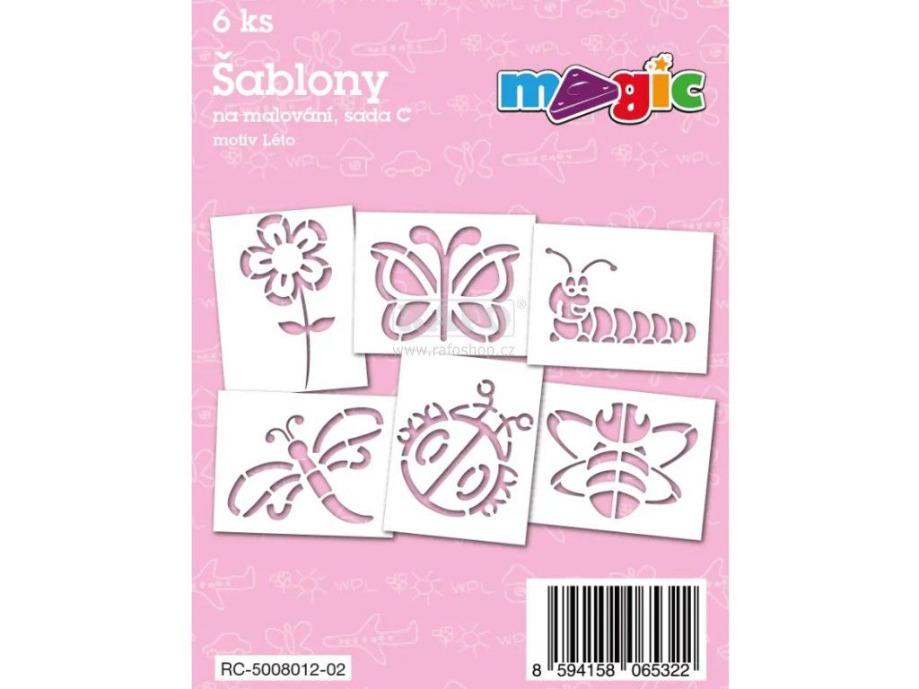 Sada 6 kusů papírových šablon na malování. Rozměr 11 x 14 cm, materiál bílý karton 220g, vhodné na všechny kreativní techniky. Doporučujeme: pro malování s magickými voskovkami (technika frotáž), i pro tupování s temperami, pro malování s foukacími fixami nebo techniku malování plastelínou. Nevhodné pro děti do 3 let, obsahuje malé dílky.Doplňkové parametry