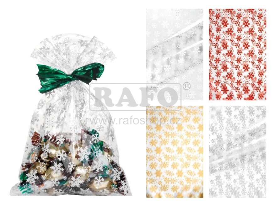 Vánoční průhledný dárkový sáček s motivem vloček v bílé, červené, zlaté nebo stříbrné barvě. Vyrobený z luxusního celofánu s potiskem. Skvělý na zabalení drobných dárků. Sáček můžete uzavřít vázací stuhou a tím ho dozdobit. Rozměr: 250 x 400 mm. Dodáváme v mixu 4 ks dle skladové zásoby.