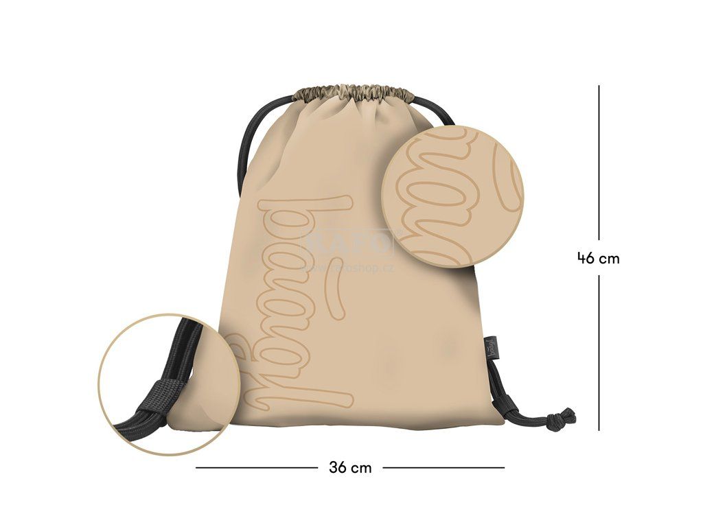 Béžový sáček na obuv či na tělocvik s logem BAAGL a pevnými tkanicemi. • Sáček na obuv či jiné drobnosti pro vaše volnočasové aktivity. • Sáček je vyroben z pevného omyvatelného materiálu. • Zdrhování pomocí pevných tkanic, které zároveň umožňují nošení na zádech. • Velikost: 36 x 46 cmDoplňkové parametry
