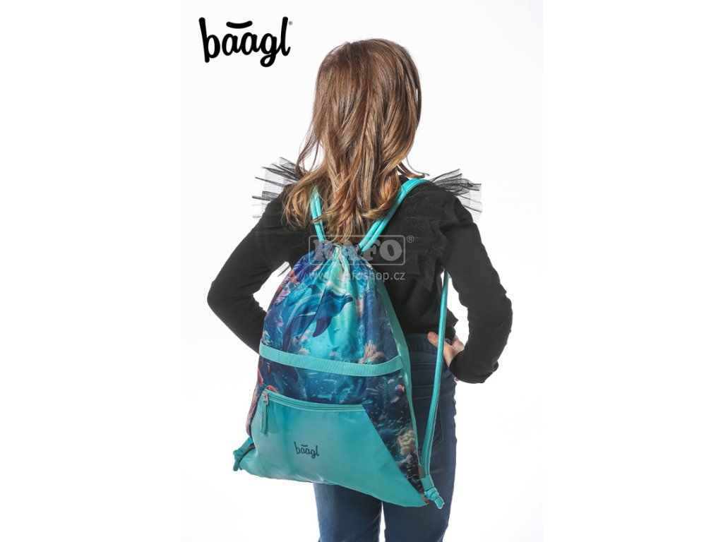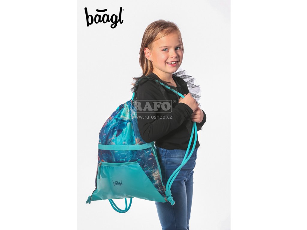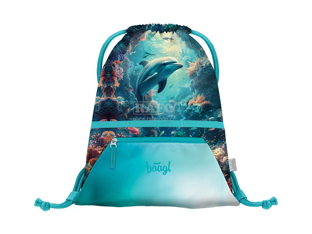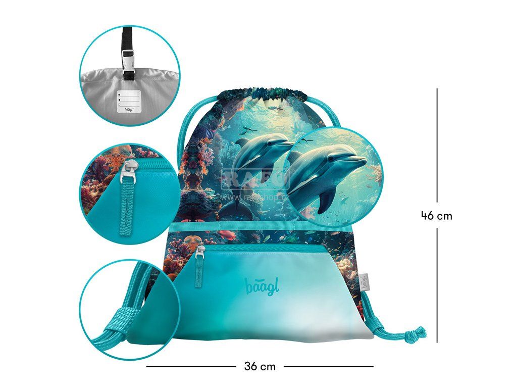 Azurově modrý sáček s motivem delfína a praktickou kapsičkou na zip je vhodný na přezůvky, tělocvik i volnočasové aktivity. • Sáček je vybaven karabinkou díky, které ho lze připevnit na aktovku. • Sáček je vyroben z pevného omyvatelného materiálu a v jeho dolní části je umístěna praktická kapsička na zip. • Zdrhování pomocí pevných tkanic, které zároveň umožňují nošení na zádech. • Velikost: 36 x 46 cmDoplňkové parametry